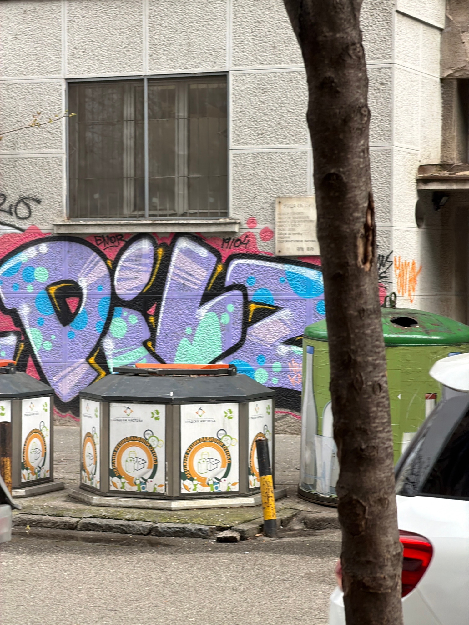 The image shows a street scene in Belgrade, Serbia. A tree branch is in the foreground, partially obscuring the view. Behind the branch, there is a building wall covered with graffiti, a window, a gre…read more