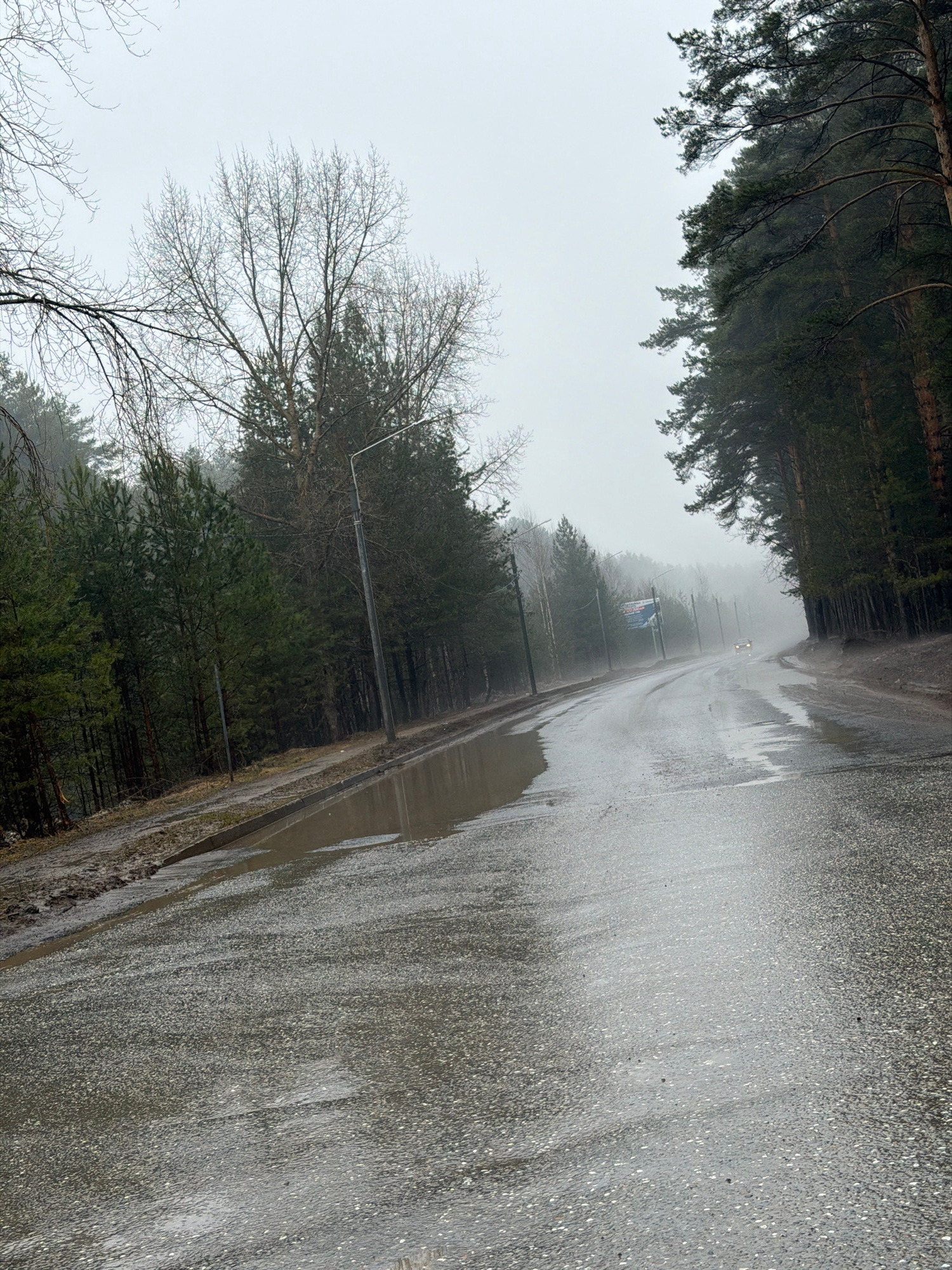 The image depicts a wet road running through a foggy forest. The road surface is gray and appears to be asphalt. Puddles are visible along the roadside. Tall trees line both sides of the road, their b…read more