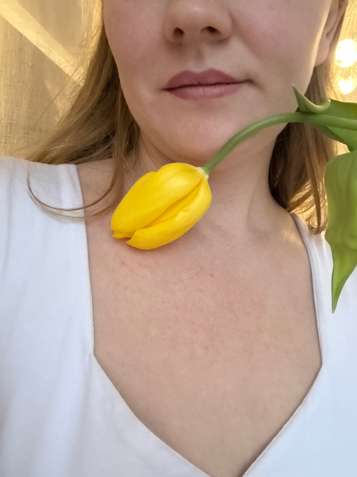 A close-up, rotated view of a fair-skinned woman with blond hair. She is wearing a white top. A yellow tulip with a green stem and leaf rests on her collarbone. Her lips are visible. The image is lit…read more