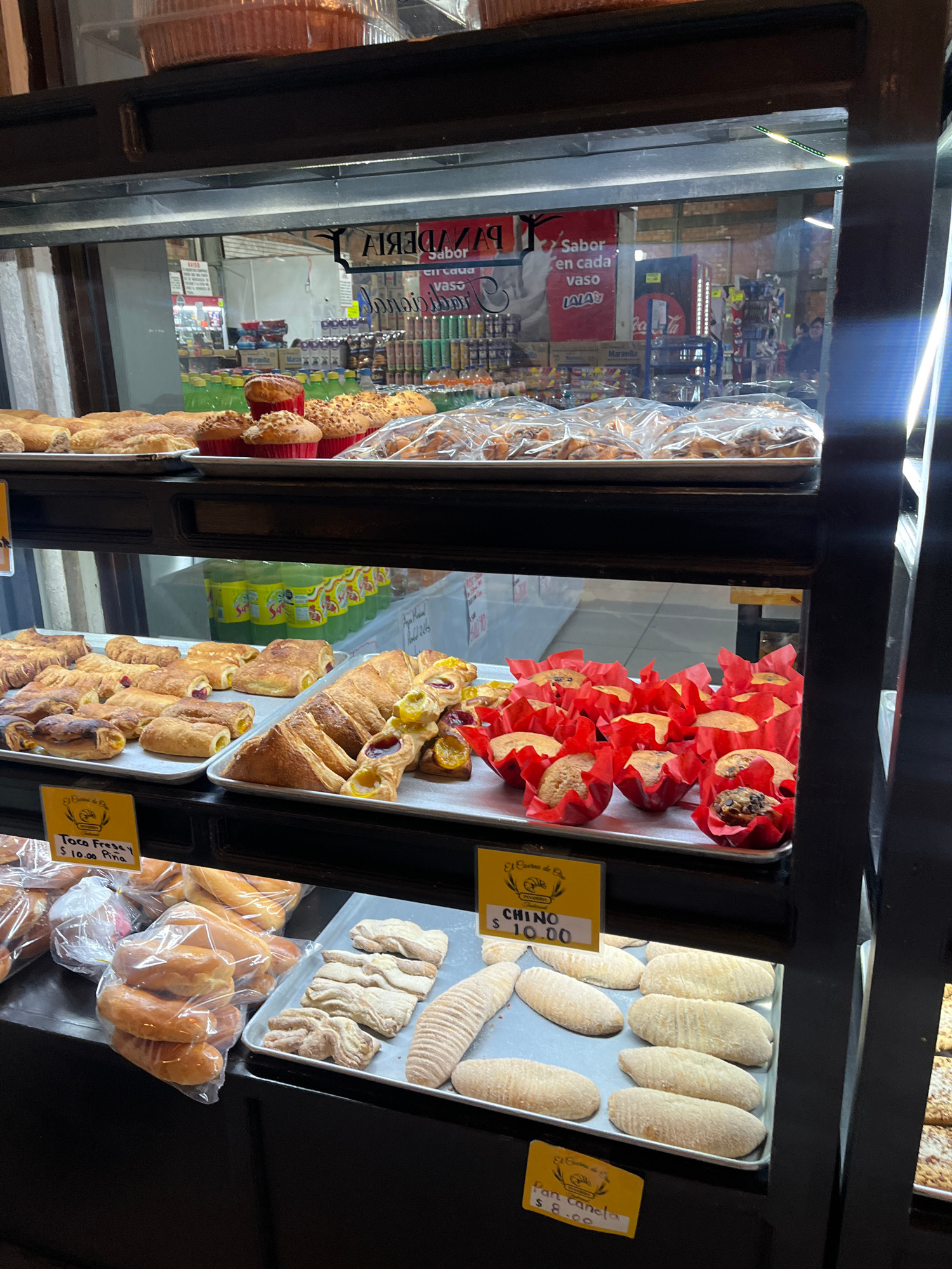 A bakery display case in Cholula, Mexico, showcases various pastries. The leftmost section features assorted breads, followed by muffins in red paper cups and pastries with fruit fillings. The next se…read more