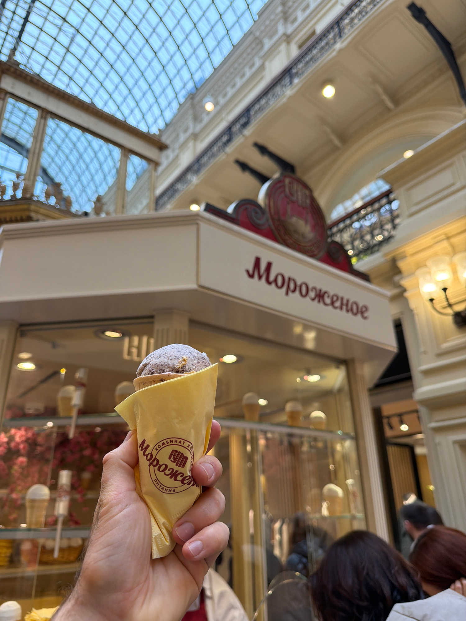 A person holds an ice cream cone in front of a kiosk in GUM department store, Moscow, Russia. The ice cream is wrapped in a yellow paper wrapper printed with the word “Мороженое” (ice cream) in red. T…read more