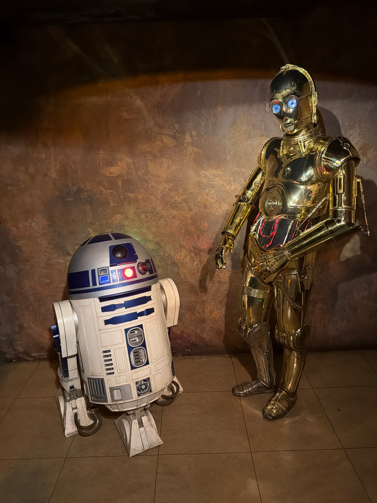A high-angle shot depicts static figures of C-3PO and R2-D2 against a textured, mottled brown backdrop, resembling a wall or floor. C-3PO, a golden humanoid robot, lies on its side, with visible interβ¦read more