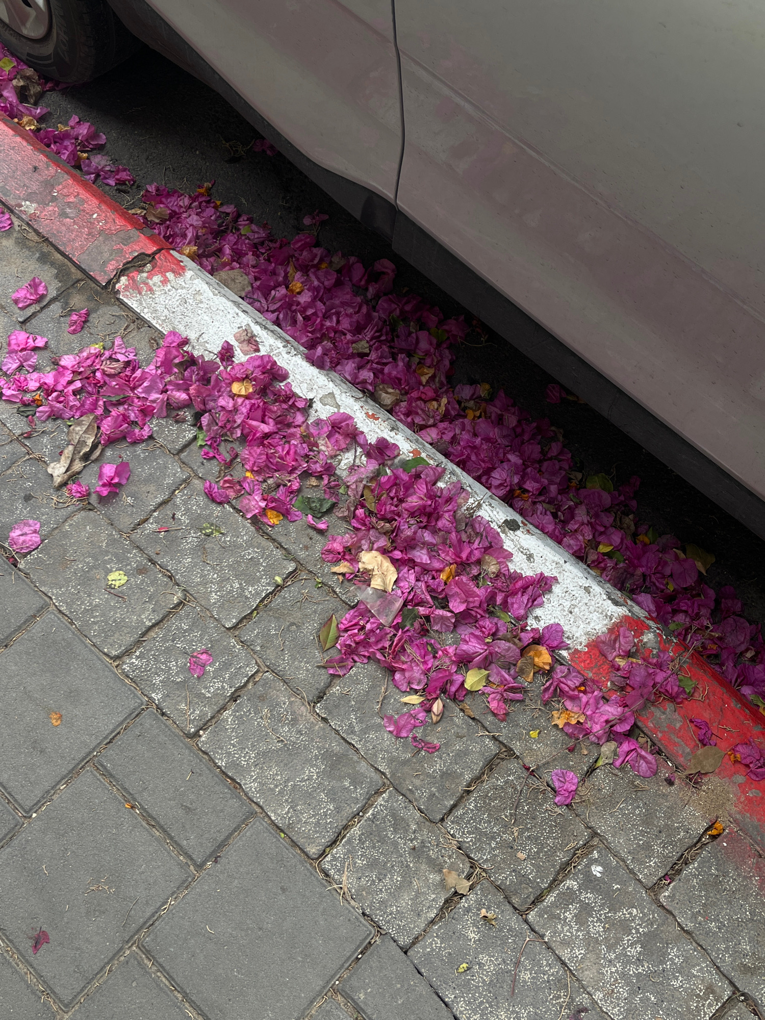 A street-level view shows bougainvillea flowers, primarily pink, scattered along a curb next to a parked car. The curb is painted white with a red stripe along the edge. The flowers are also on the gr…read more