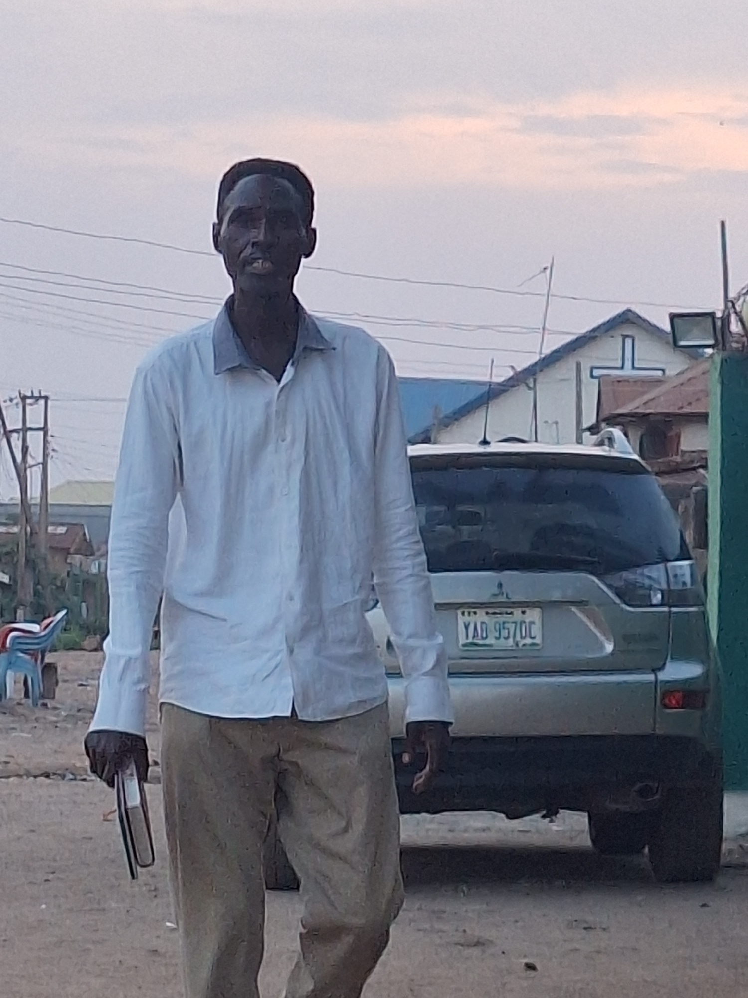 The image, taken in Sabon Tasha, Nigeria, features an adult man standing on a street or unpaved road, looking directly towards the camera. He is dark-skinned, with short, dark hair, and is dressed in…read more