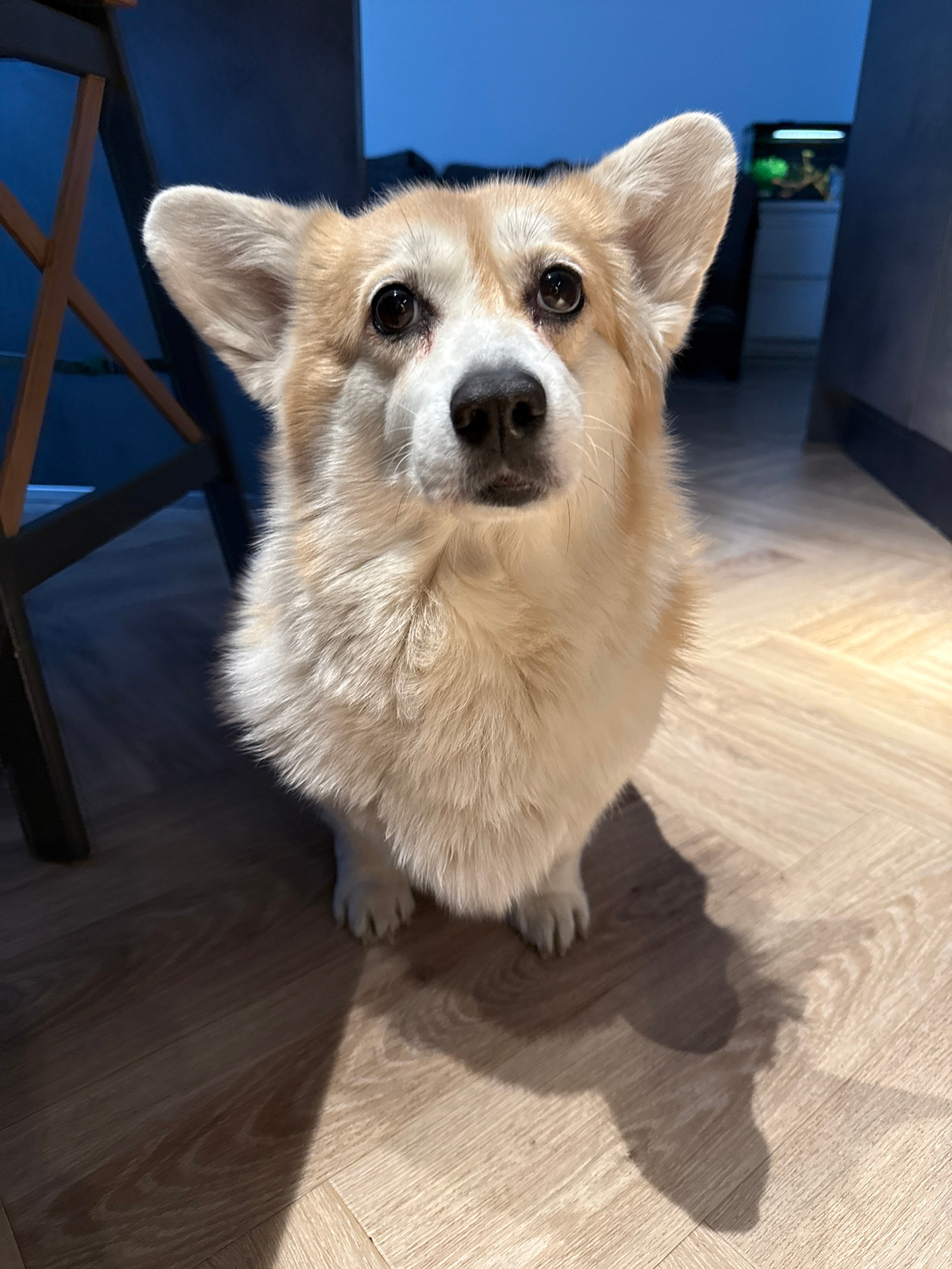 A light-furred, tan and white corgi dog sits on a light wood floor. The dog is looking directly at the camera with a slightly upturned head. Part of a dark chair leg is visible beneath the dog on the…read more