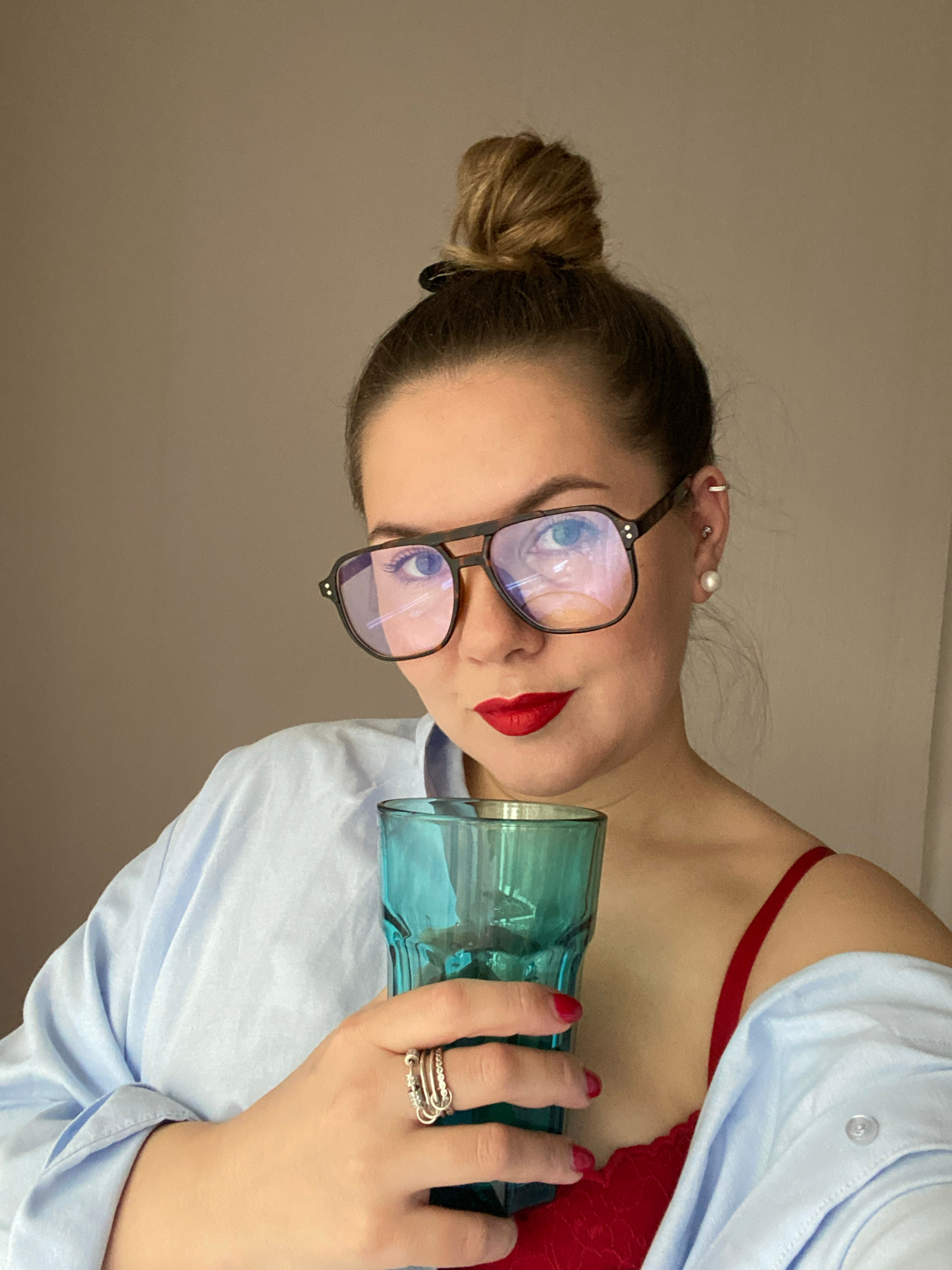 A woman with her hair in a bun, wearing glasses, red lipstick, a red bra, and a blue button-down shirt, is holding a blue glass. The location is not discernible as Izhevsk, Russia, or any other specif…read more