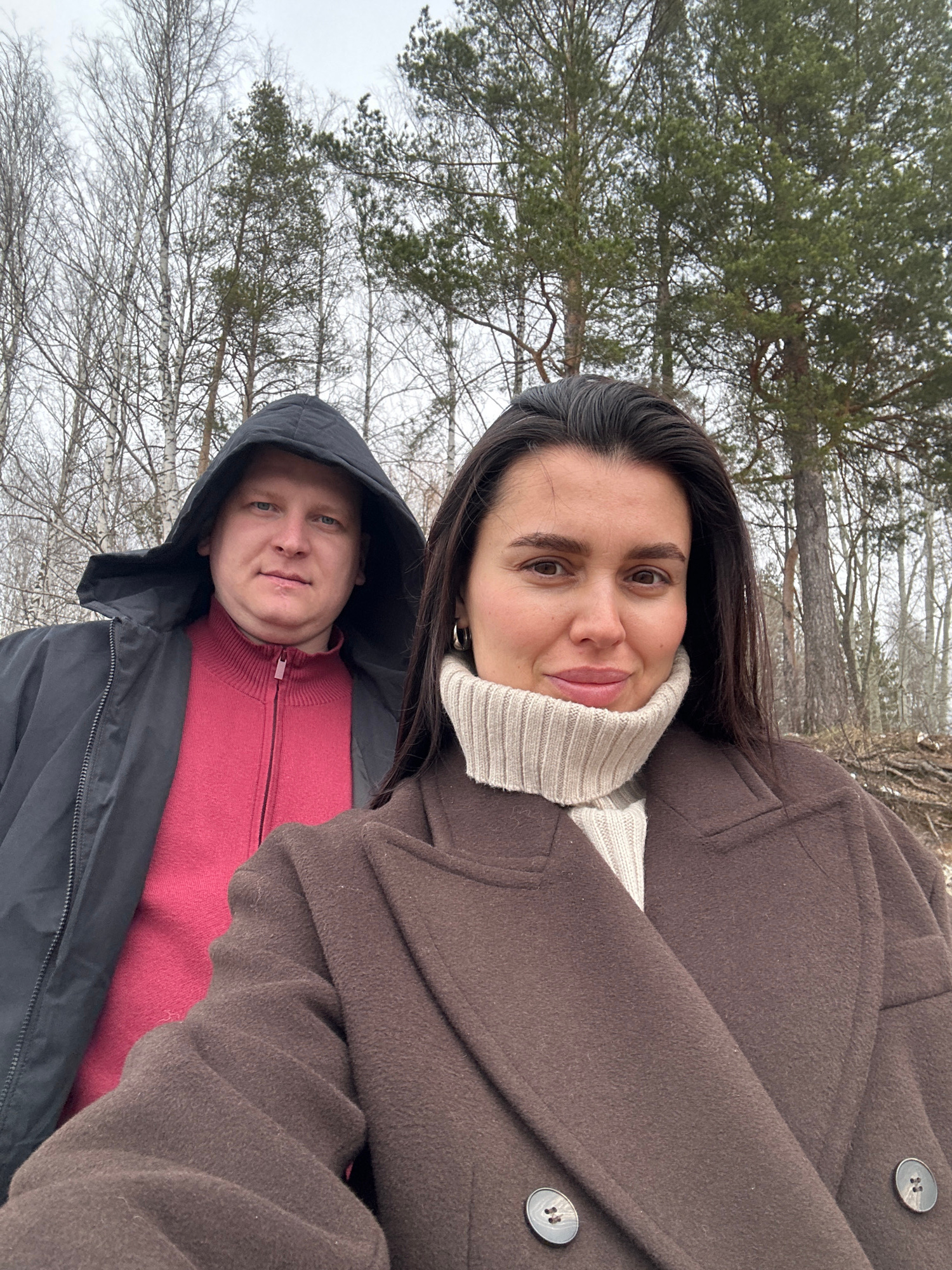 The image, rotated 90 degrees clockwise, captures a selfie of a woman and a man in a wooded outdoor setting, likely in Chaikovsky, Russia. The scene suggests a cold season, such as winter or early spr…read more