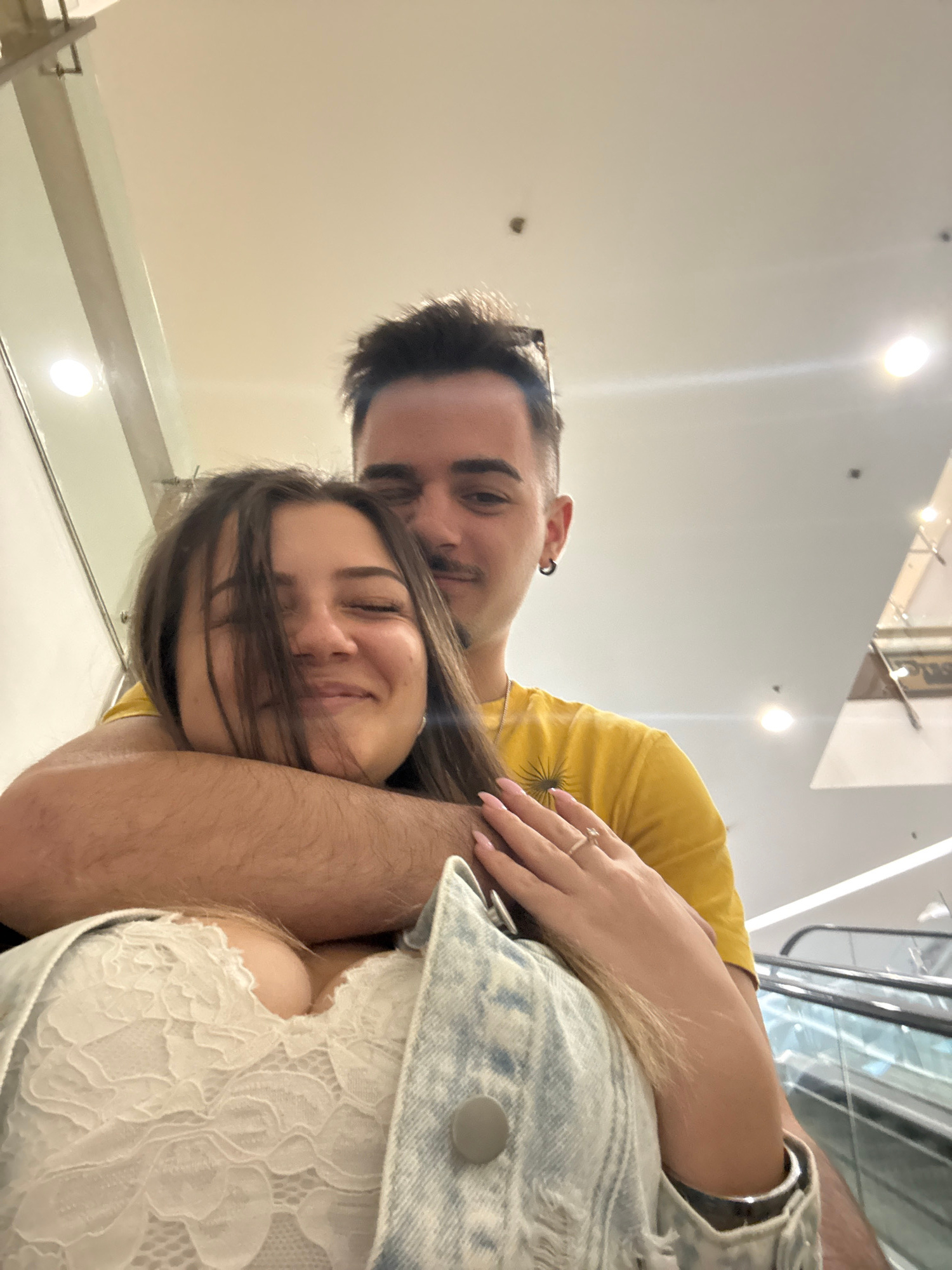 A low-angle shot depicts a couple embracing indoors, with the location possibly in a commercial area. The man, positioned behind the woman, is wearing a yellow t-shirt and has short, dark hair, a visi…read more