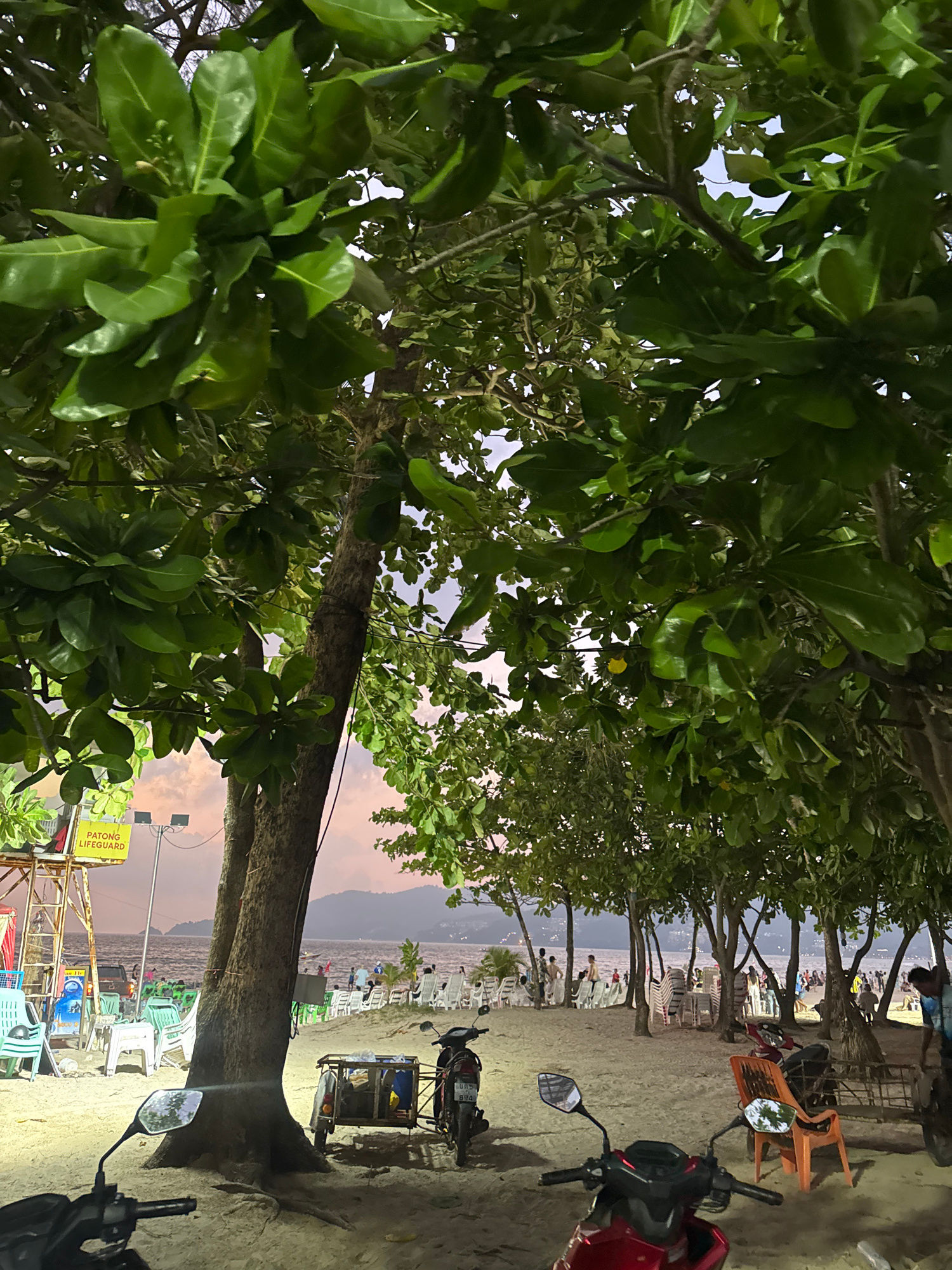 The image shows a beach scene in Patong, Thailand, at dusk or dawn. In the foreground, large-leafed trees obscure a portion of the view. Beyond the trees, the beach is visible, featuring rows of beach…read more