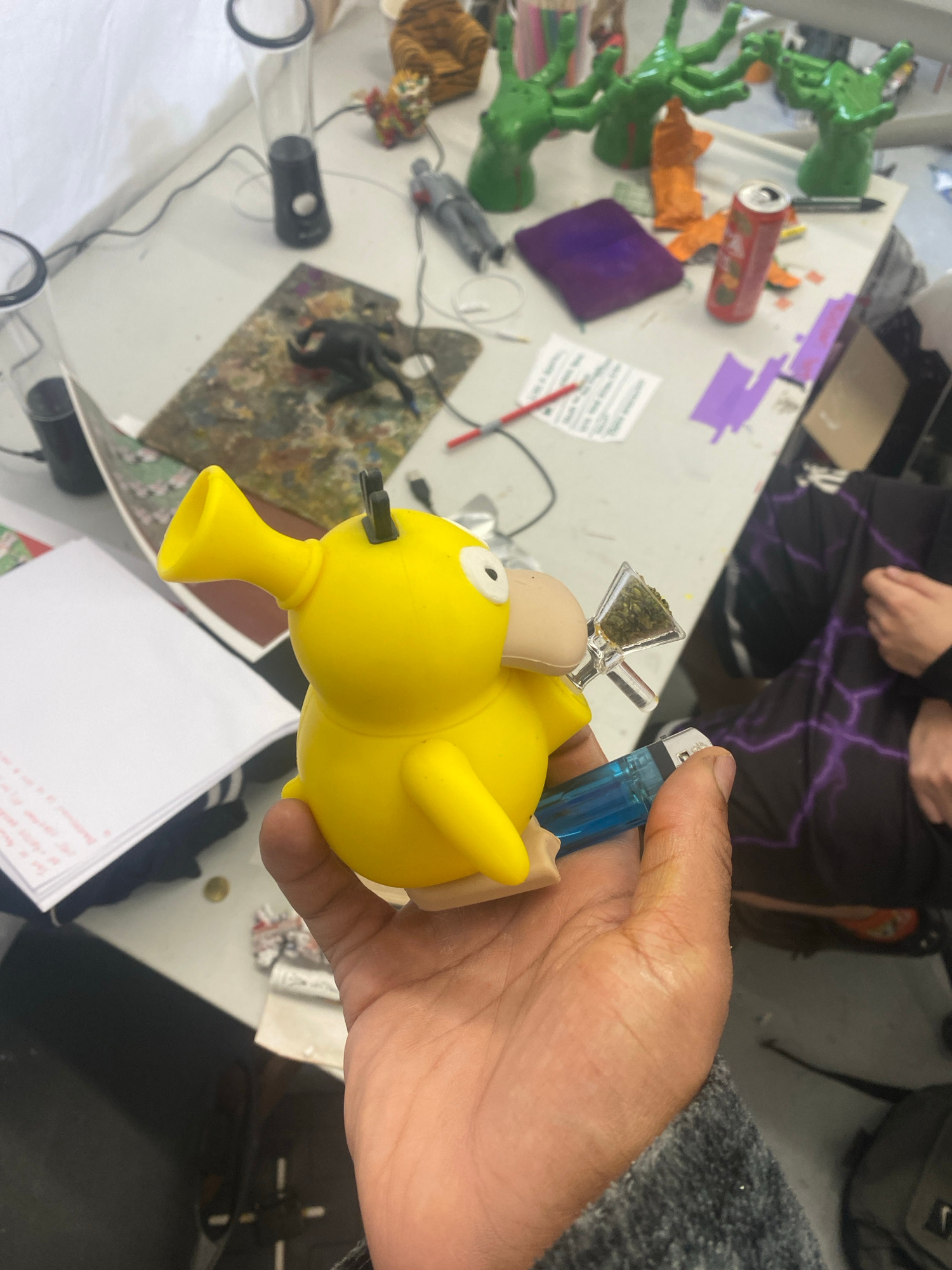 The image shows a cluttered tabletop surface with various objects including green plastic figures resembling plants, a can, and assorted art supplies such as paint and brushes. A yellow duck-shaped ob…read more