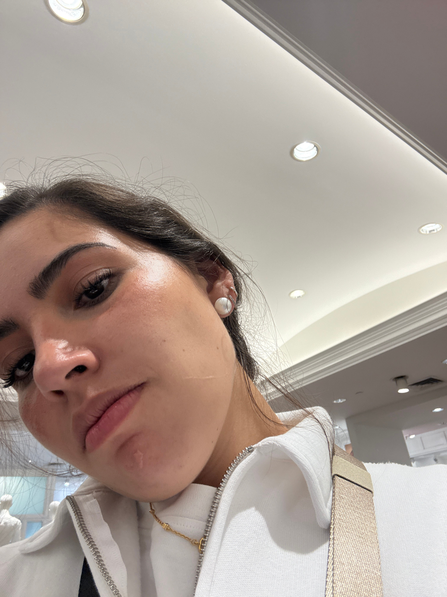 The image is a close-up, slightly tilted selfie of a woman. She has dark hair, dark eyes, and fair skin. She is wearing a white earring and a white jacket with a zipper. There is a beige strap visible…read more