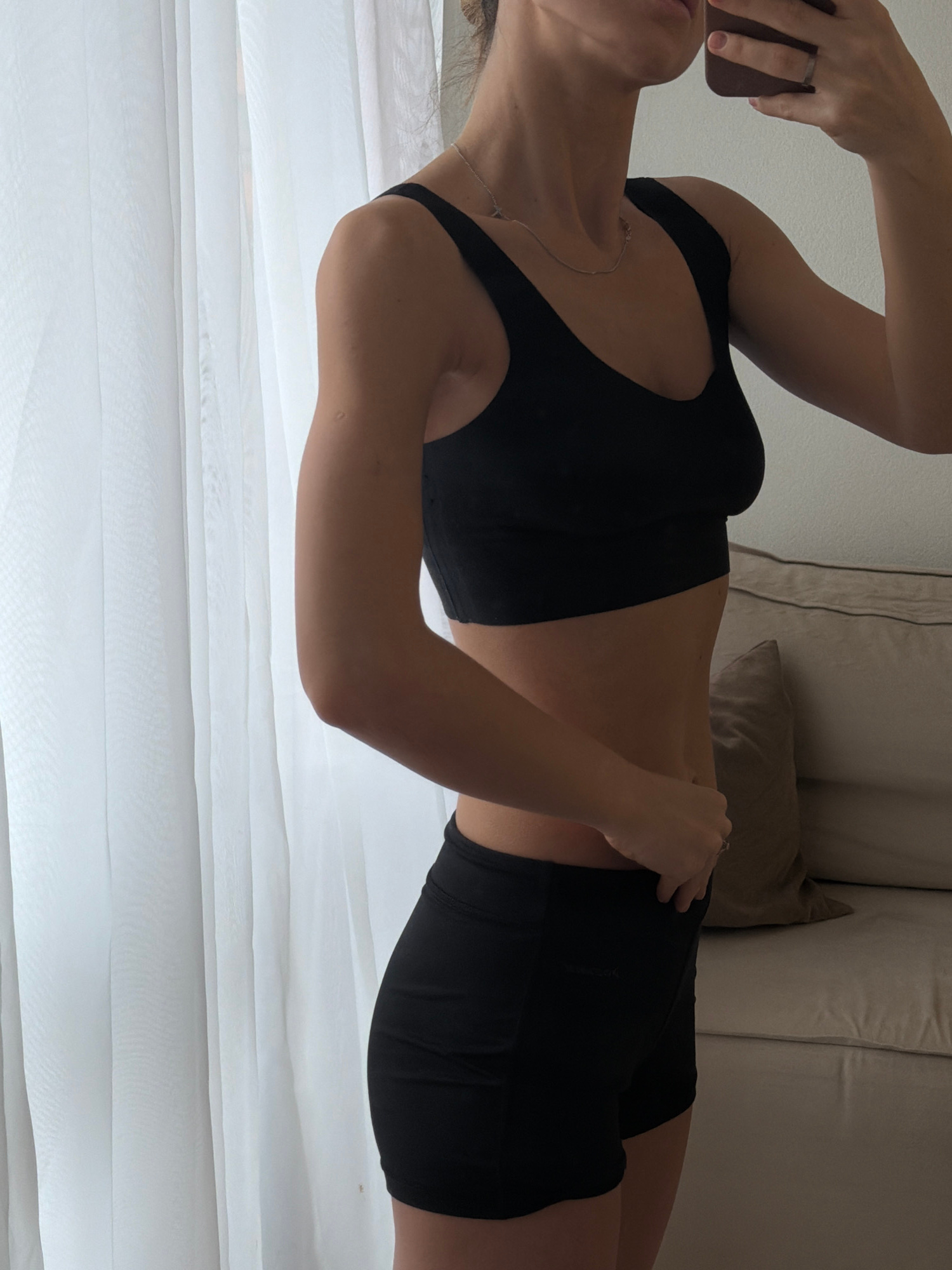A woman lies on a white bed or couch, dressed in a black sports bra and black shorts. She holds a phone up and is likely taking a selfie. The scene includes a pillow behind her and part of the couch.…read more