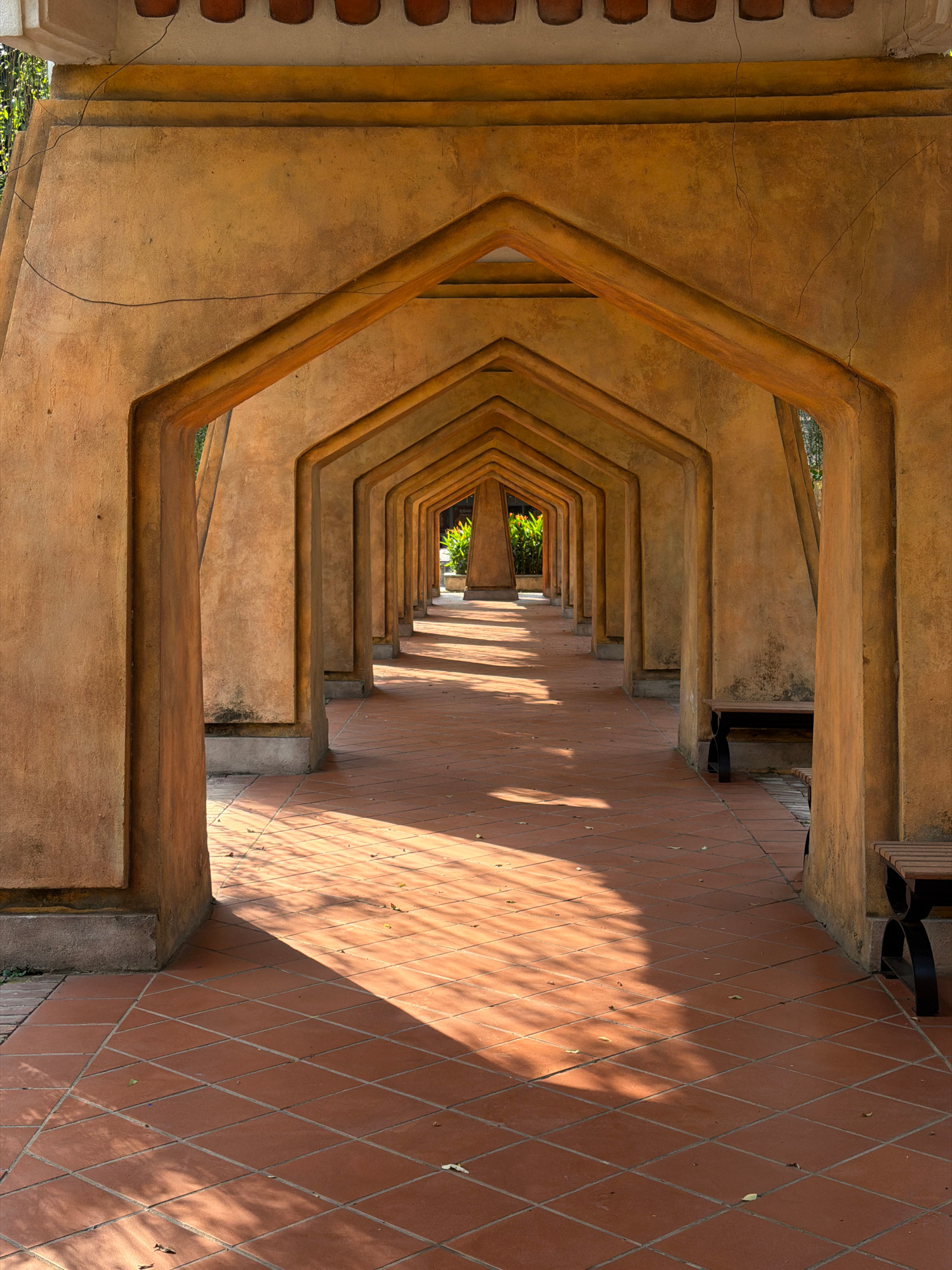 An eye-level, medium shot presents a symmetrical tunnel structure within what is likely a building in Đà Nẵng, Vietnam. The tunnel is defined by a series of repeating hexagonal frames, constructed fro…read more