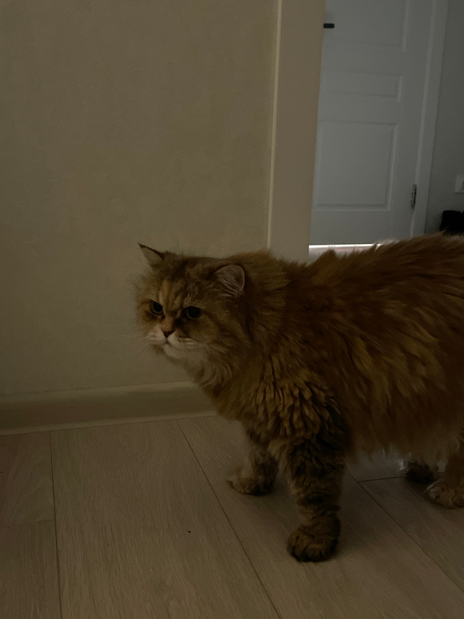 A long-haired orange cat is positioned near a white baseboard and a white door, with light-colored wood-like flooring visible in the background. The cat's head is oriented downwards, and one of its pa…read more