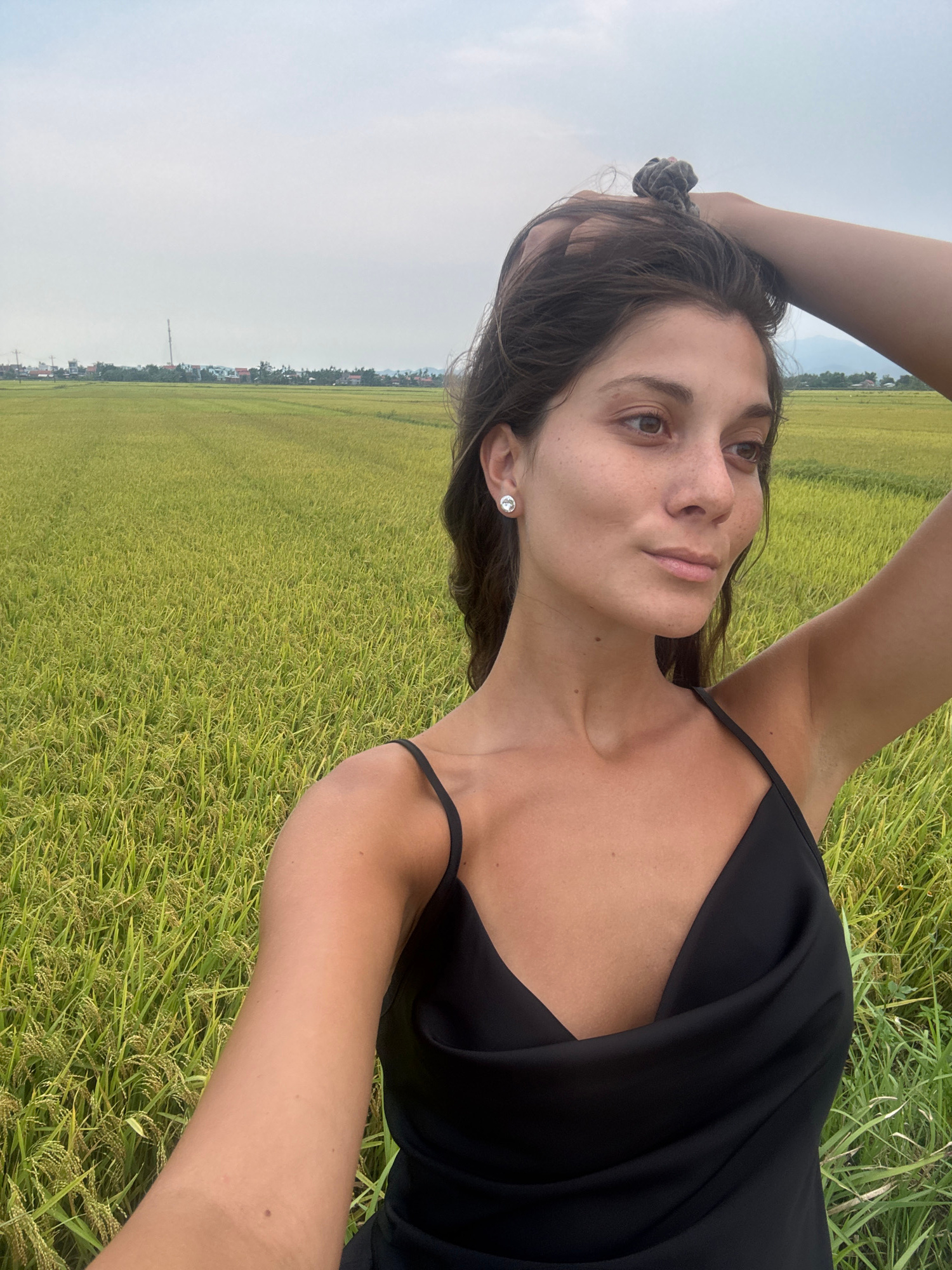 A young woman is prominently featured in this outdoor portrait, positioned as if lying on her back in a vast green field and looking directly upwards towards the viewer. She has medium-brown hair, whi…read more