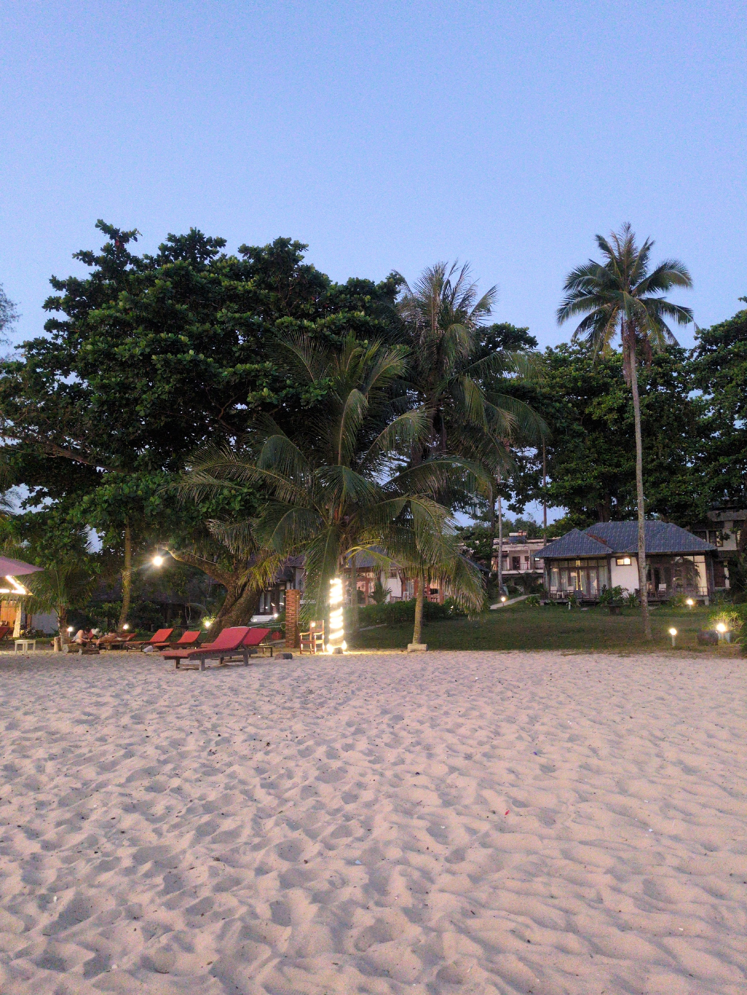 The image captures a scene on a beach in Phú Quốc, Vietnam, at dusk or dawn. The sky is a pale blue. Tall palm trees are visible, their trunks and fronds silhouetted against the sky, with denser folia…read more