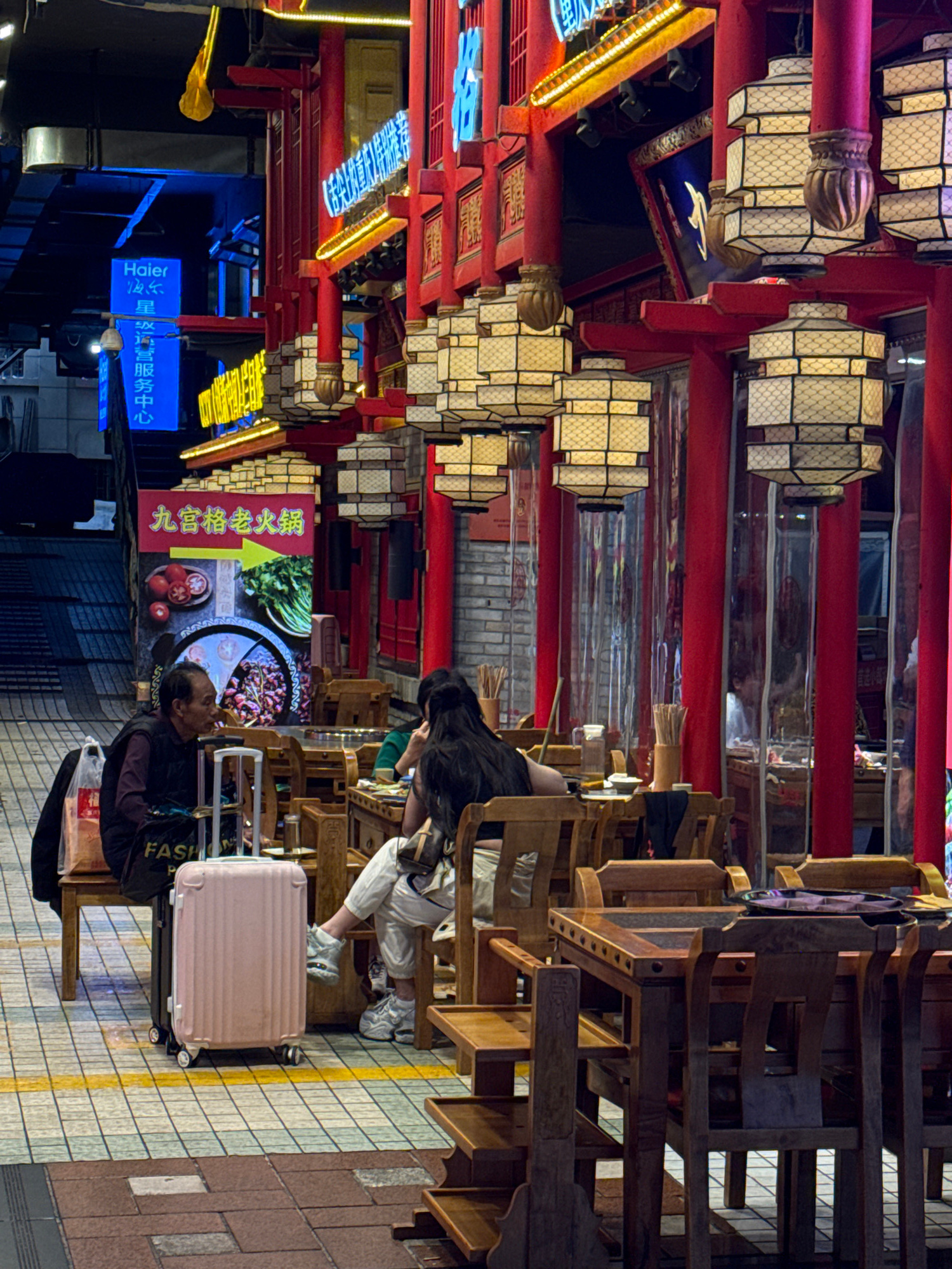 The image depicts an outdoor dining area in Yuzhong District, China. The scene features a bustling environment with people seated at wooden tables and chairs. Lanterns and neon signs adorn the overhea…read more