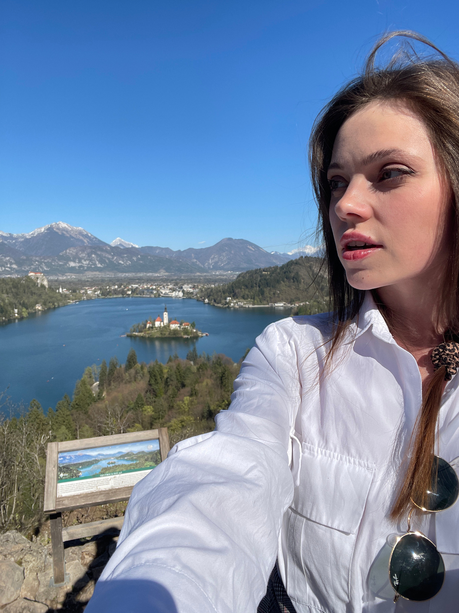 A waist-up view of a young woman in Bled, Slovenia, is seen from a low-angle viewpoint. She is on a rocky platform overlooking Lake Bled. In the background is an island in the middle of the lake with…read more