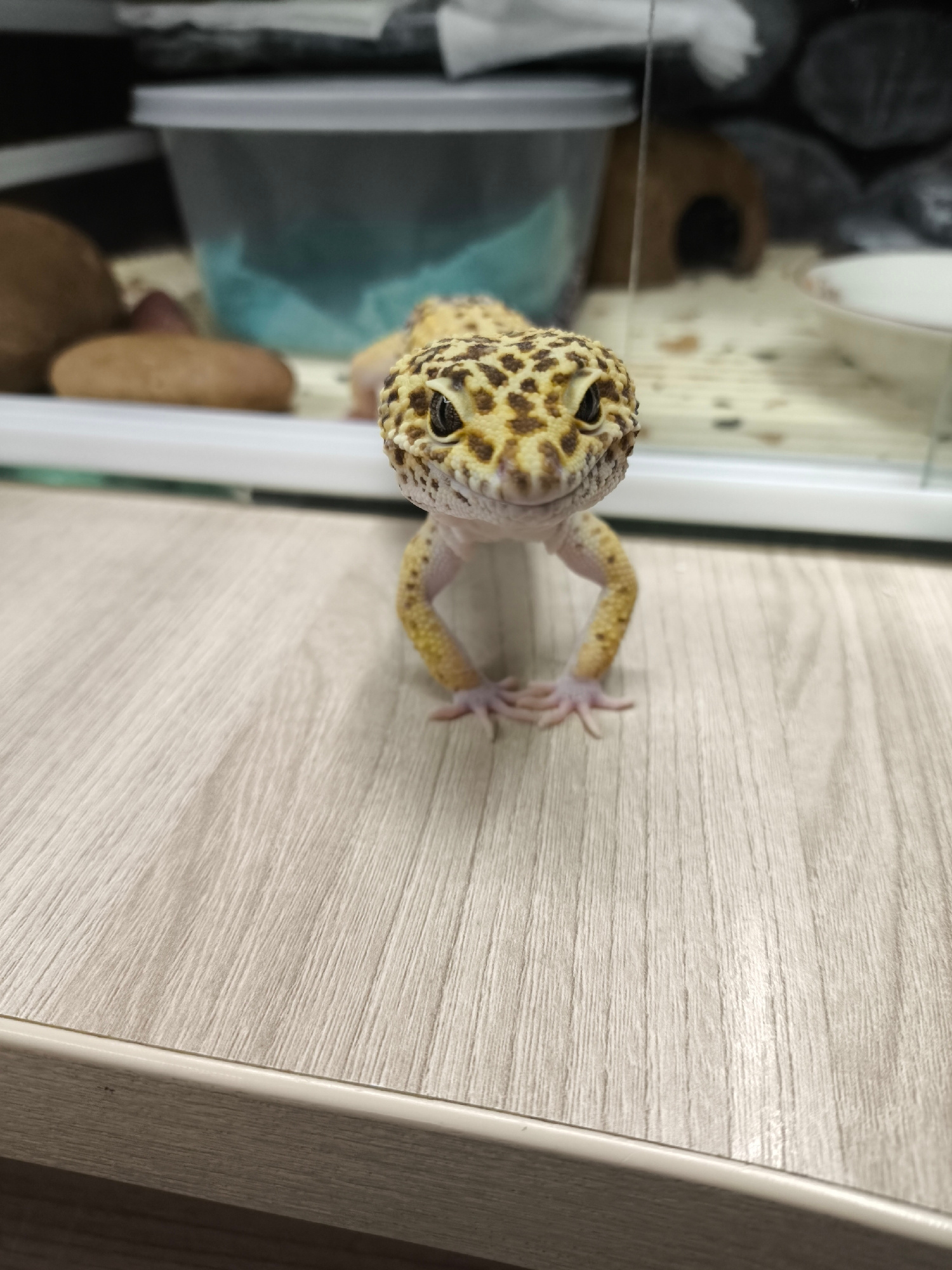 A leopard gecko stands on a light-colored wood-grain surface. Its body is positioned towards the viewer with its front legs extended and feet splayed out. The gecko features yellow and brown spots on…read more