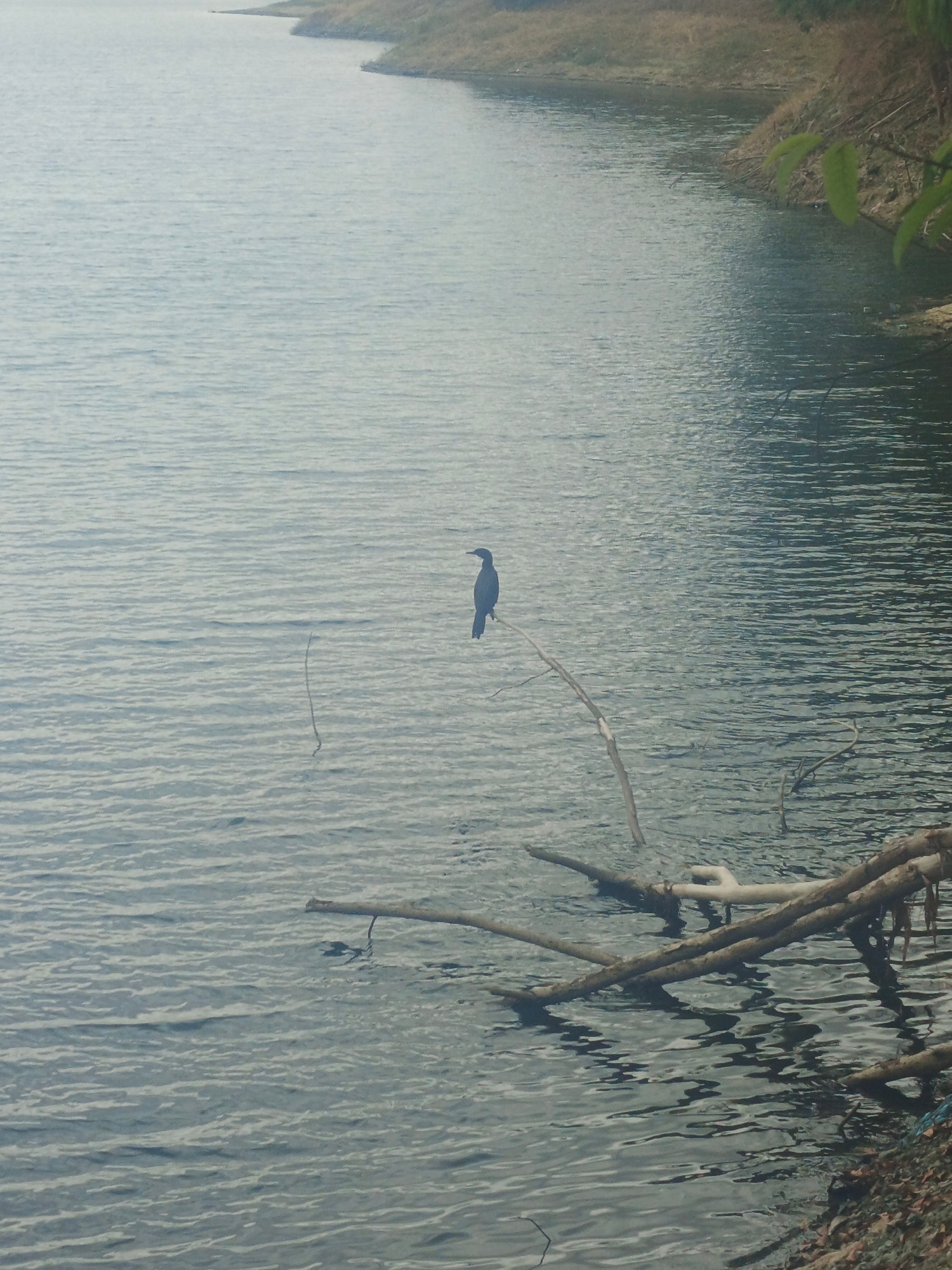 A dark-colored bird sits perched on a slender branch protruding from the water's surface. Several branches, some submerged, lie clustered to the right of the bird. The water exhibits a rippled texture…read more