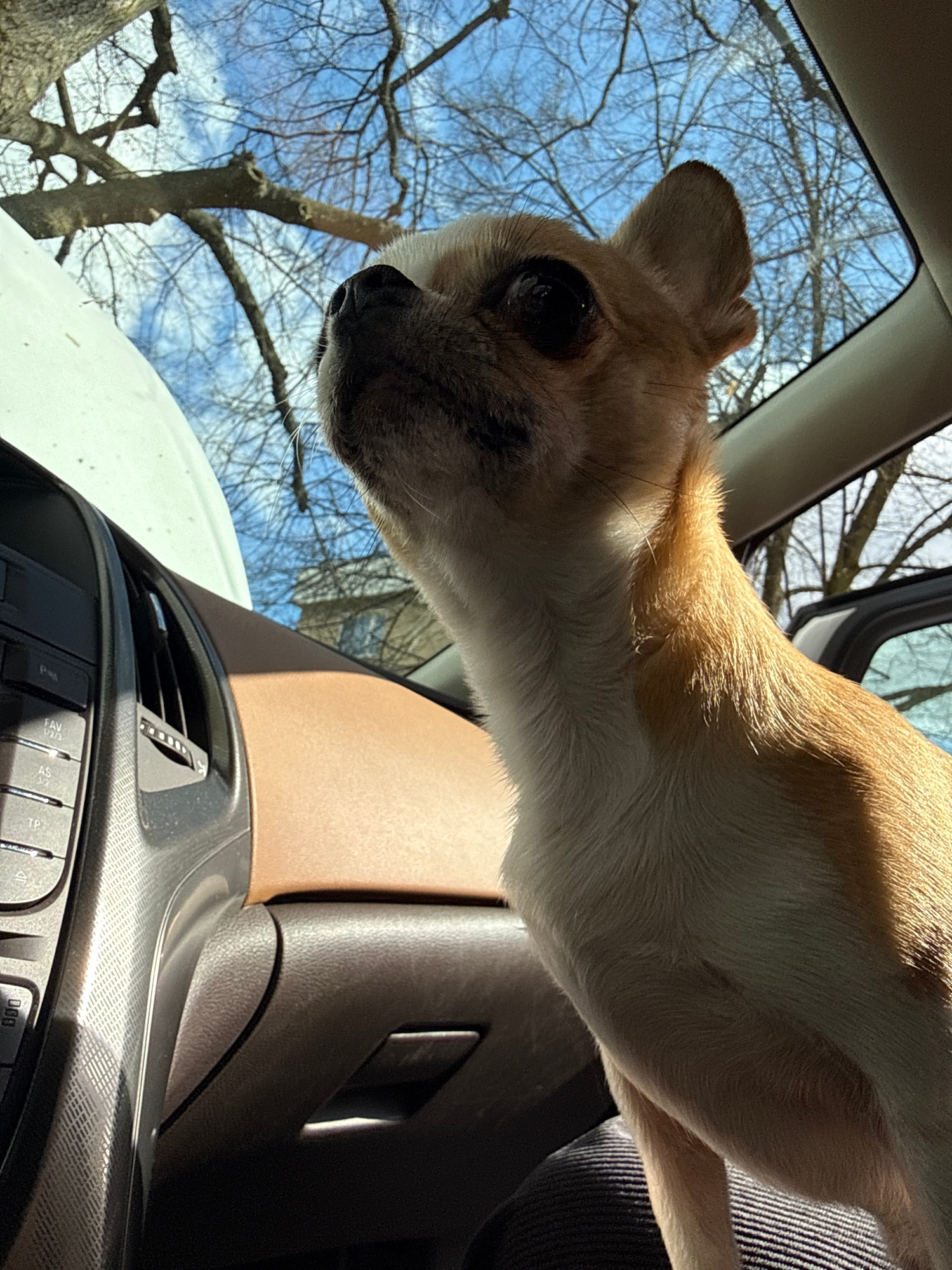 A tan chihuahua is inside a vehicle, possibly a car, looking out of the window. The dog's head is tilted upward toward the window, which shows a view of bare tree branches against a bright blue sky. T…read more