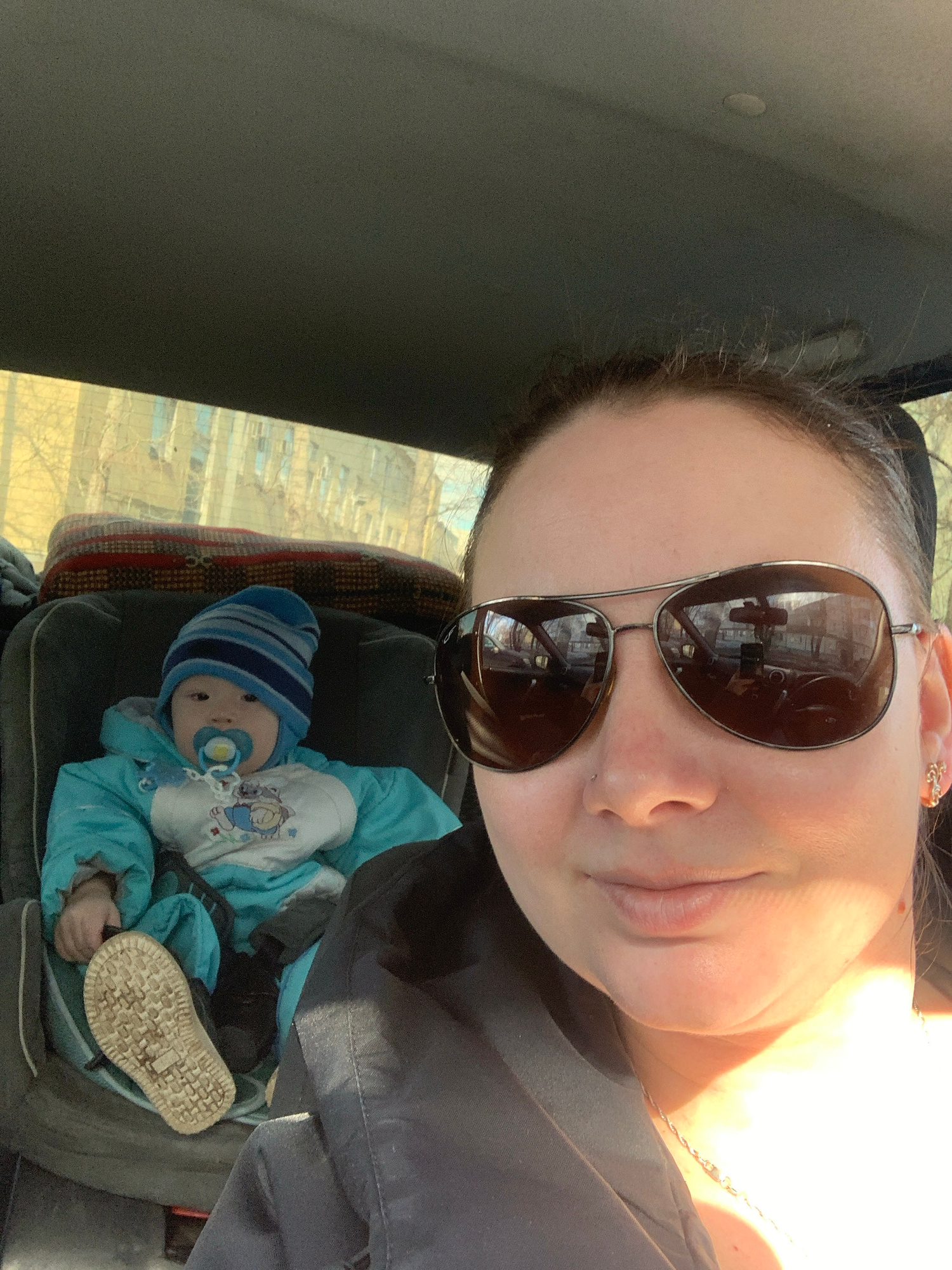 The image shows a selfie of a woman wearing sunglasses, taken inside a vehicle, likely a car. In the background and partially visible, there is a child in a blue outfit, lying in what appears to be a…read more