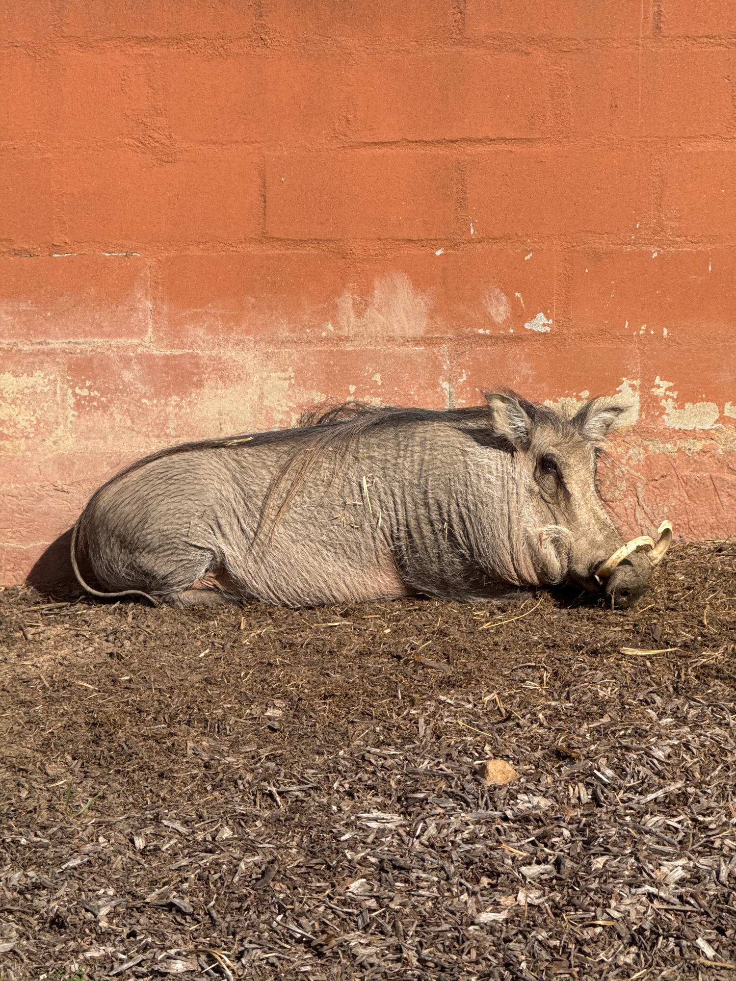 A deceased warthog lies on its side, partially on a red brick surface and partially on a ground covered with dark mulch and twigs. The warthog's tusks are visible. The location is Stellenbosch Nu, Sou…read more