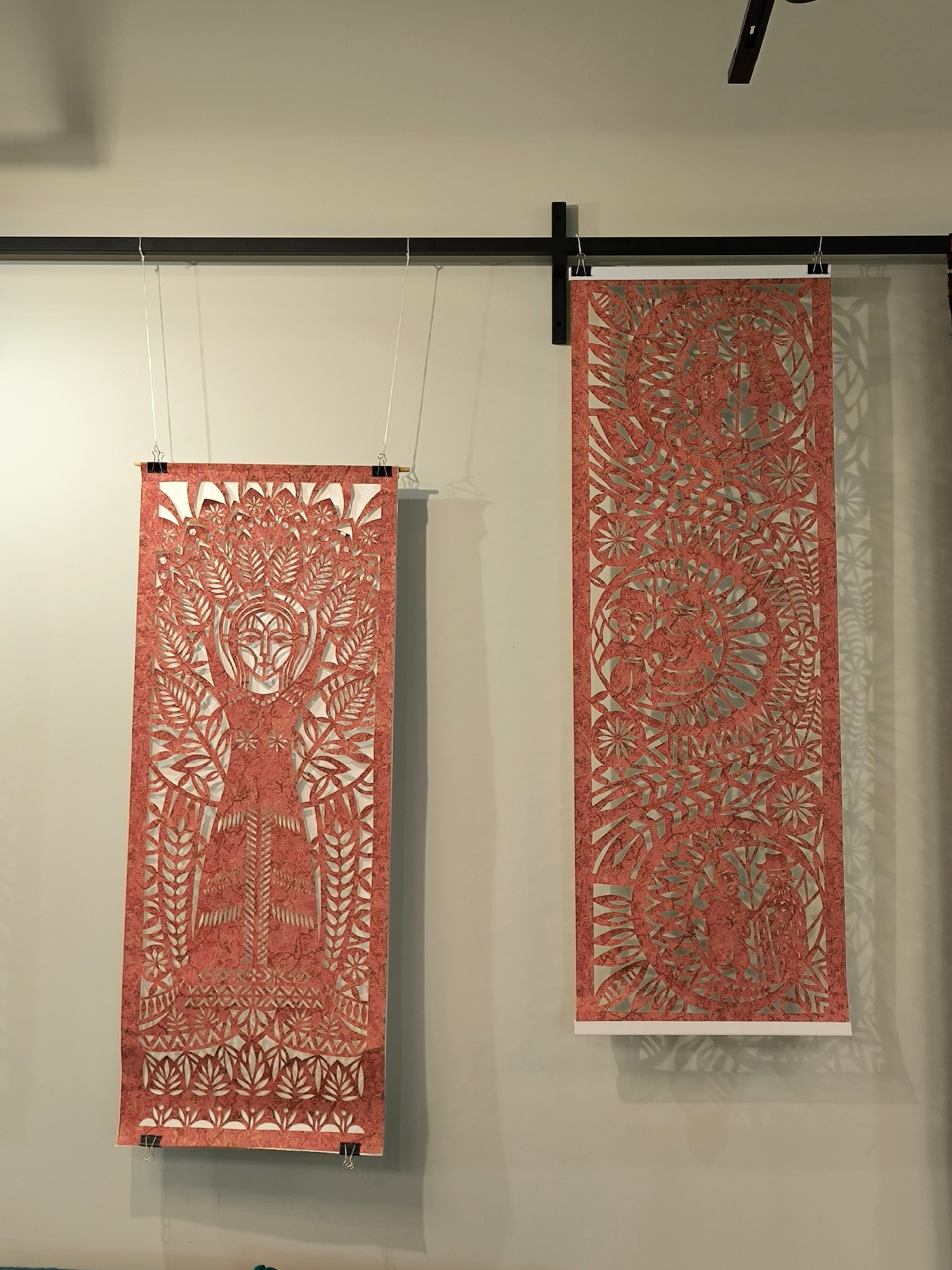 Two decorative art pieces hang on a wall in Vinnytsia, Ukraine. The pieces are rectangular, with intricate designs cut out of a textured reddish-brown material, possibly paper or thin corkboard, revea…read more