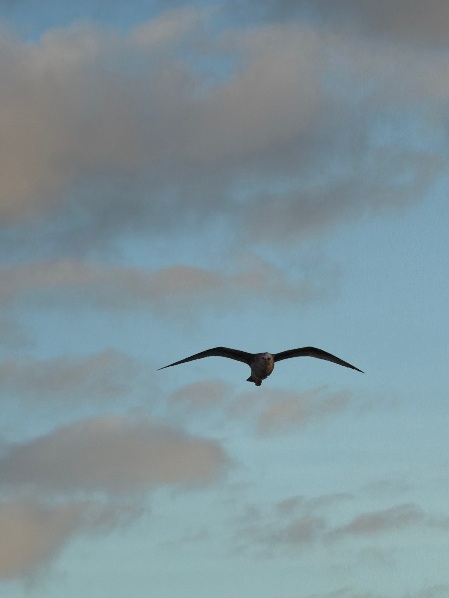A bird flies through the air. It is silhouetted against a cloudy sky.