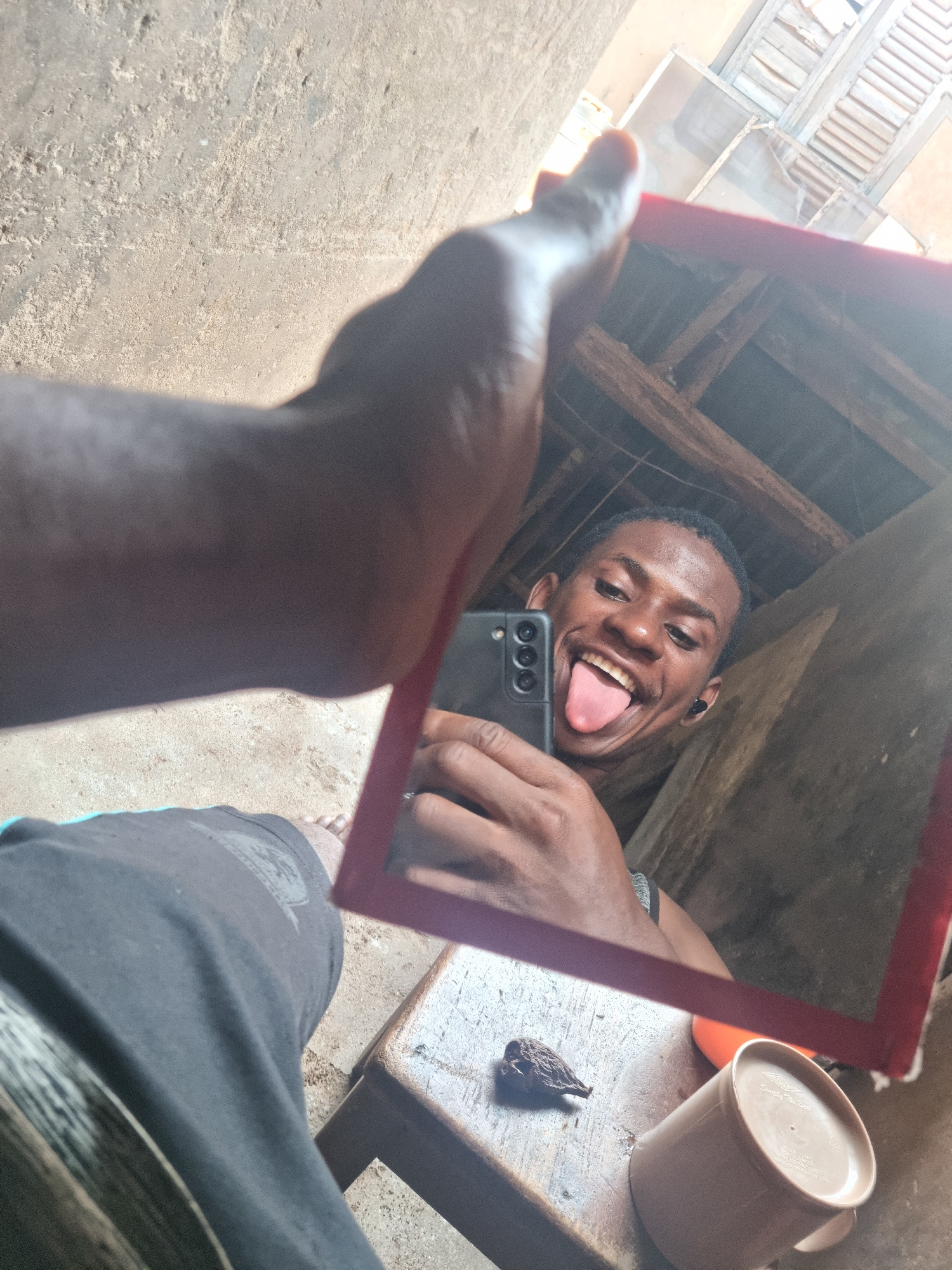 A mirror selfie captures a young man making a playful expression, sticking out his tongue and smiling broadly, reflected within a red-framed mirror. He has short dark hair and is wearing a dark earbud…read more