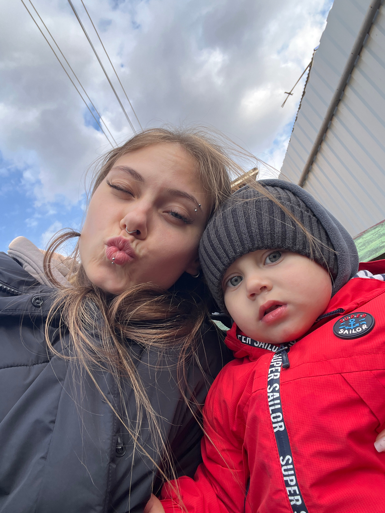 A woman and a young child are posing for a selfie. The woman has light skin, brown hair, and facial piercings. She is puckering her lips towards the camera. The child is wearing a gray beanie and a re…read more
