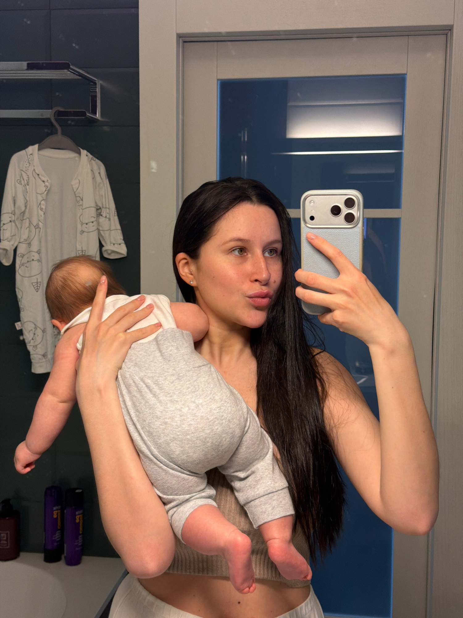 This mirror selfie, taken in what appears to be a bathroom, shows a woman holding an infant. The setting is likely a residence in Khimki, Russia. The main subject is a woman with long, dark hair, lig…read more