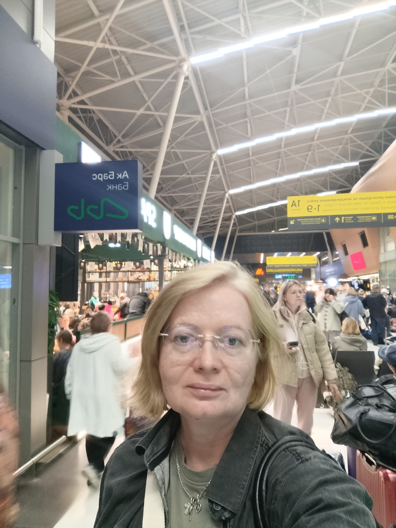 Here is a description of the image: A woman with blonde hair and glasses is taking a selfie in what appears to be an airport terminal. She is wearing a dark jacket and a t-shirt with a necklace. The…read more