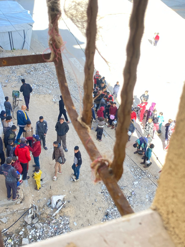 This elevated, downward-looking image captures an outdoor scene in Khan Yunis, Palestinian Territory. The immediate foreground is blurred by three vertical, gnarled brown elements, possibly rusted reb…read more