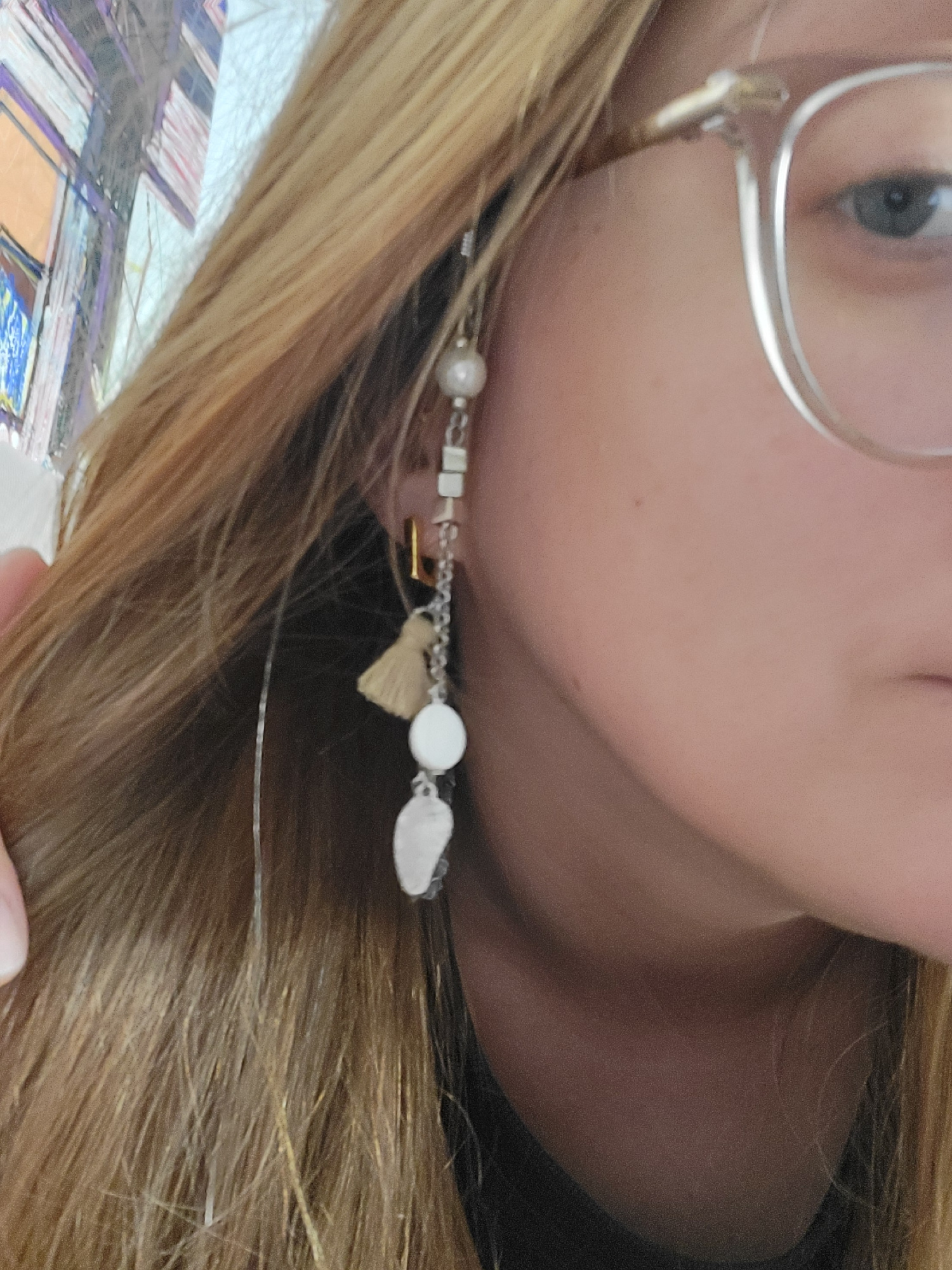 The image shows a close-up of a person's face, turned slightly to the side. The individual has fair skin, blonde hair, and is wearing glasses. A decorative hair accessory with beads and charms is visi…read more