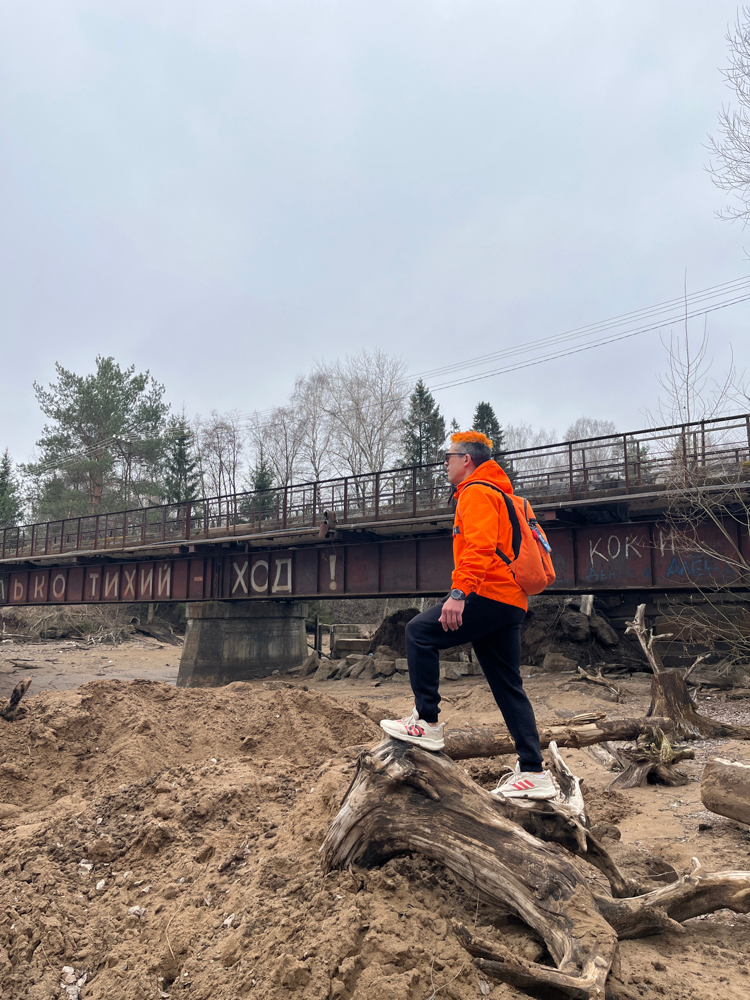The image shows a person standing on a tree root on the bank of a body of water in Chaikovsky, Russia. The person is wearing an orange jacket, black pants, white sneakers with red stripes, and a cap t…read more