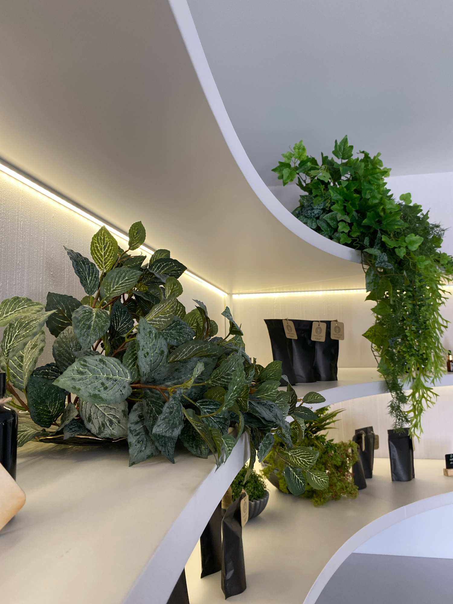 The image shows an indoor decorative staircase in an unknown location, not necessarily Votkinsk, Russia. The staircase is primarily white and has a modern, curved design. It is adorned with artificial…read more