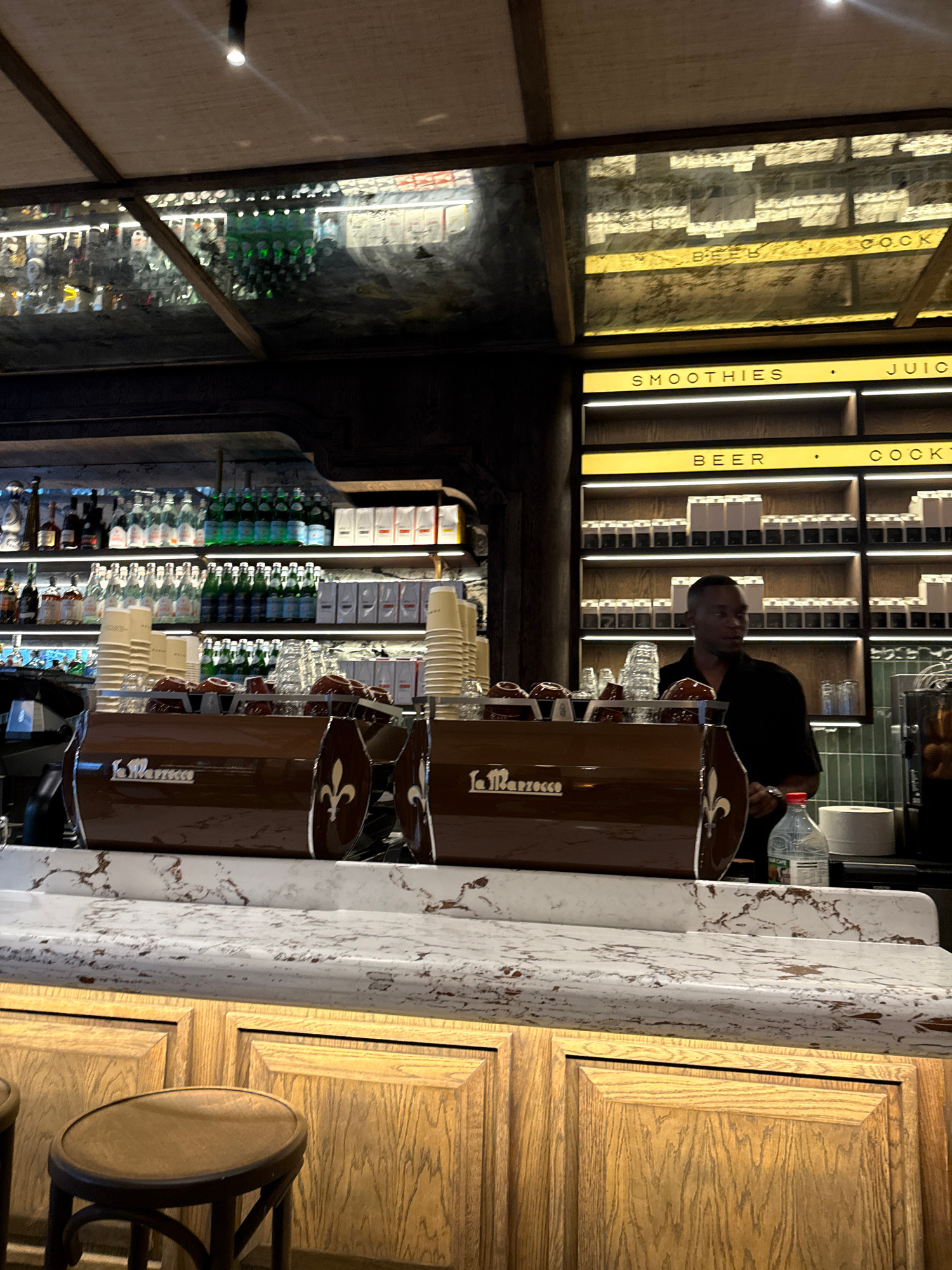 Here is a detailed description of the image: **Scene:** Interior shot of a cafe or bar. **Location:** Based on visual details, likely in Cape Town, South Africa. **Subjects & Objects:** * A man inβ¦read more