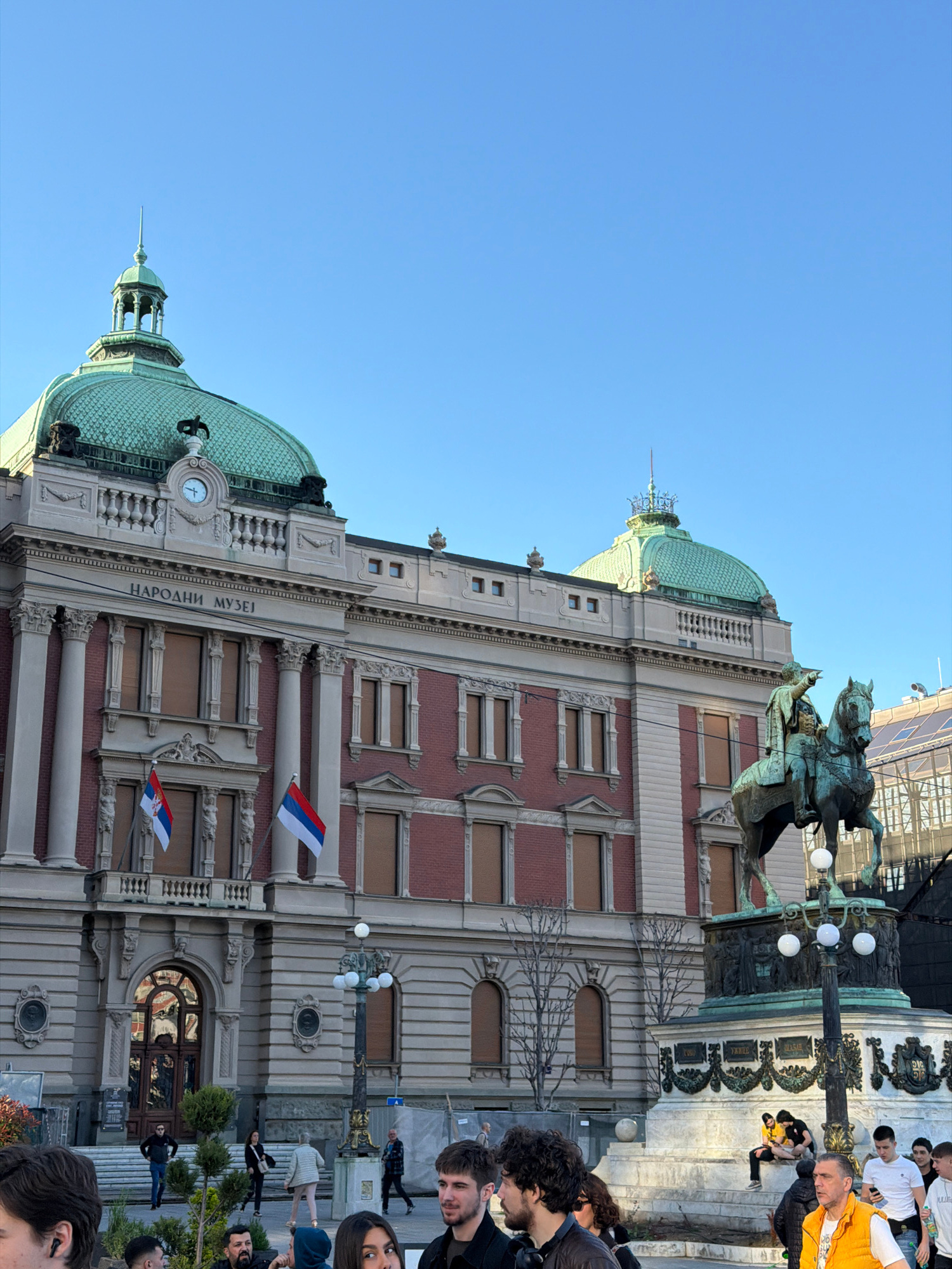 The image shows the National Museum of Serbia in Belgrade. The building has a red brick and white stone facade with green domes and spires. The inscription "НАРОДНИ МУЗЕЈ" (National Museum) is visible…read more