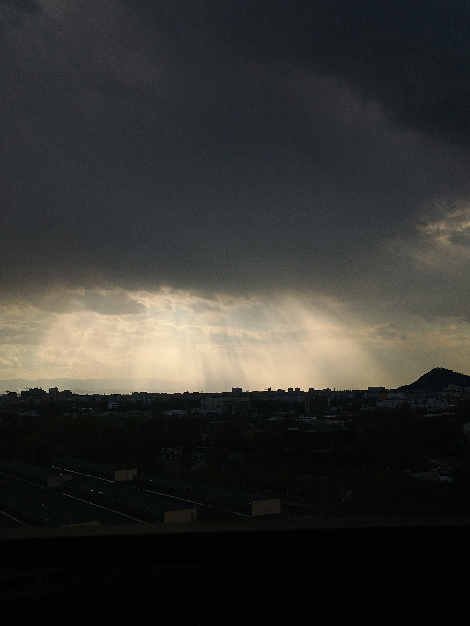 The image depicts a cityscape under a dramatic sky. To the left, dark storm clouds dominate, while to the right, shafts of sunlight break through lighter clouds, illuminating a densely built urban are…read more