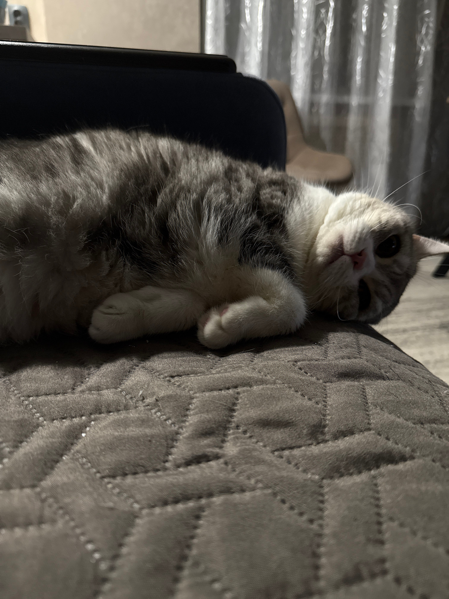 A grey and white cat is lying on its side on a grey quilted sofa. The cat's head is closest to the viewer, and it is looking toward the camera. The cat is resting on a chair next to the sofa. Light is…read more
