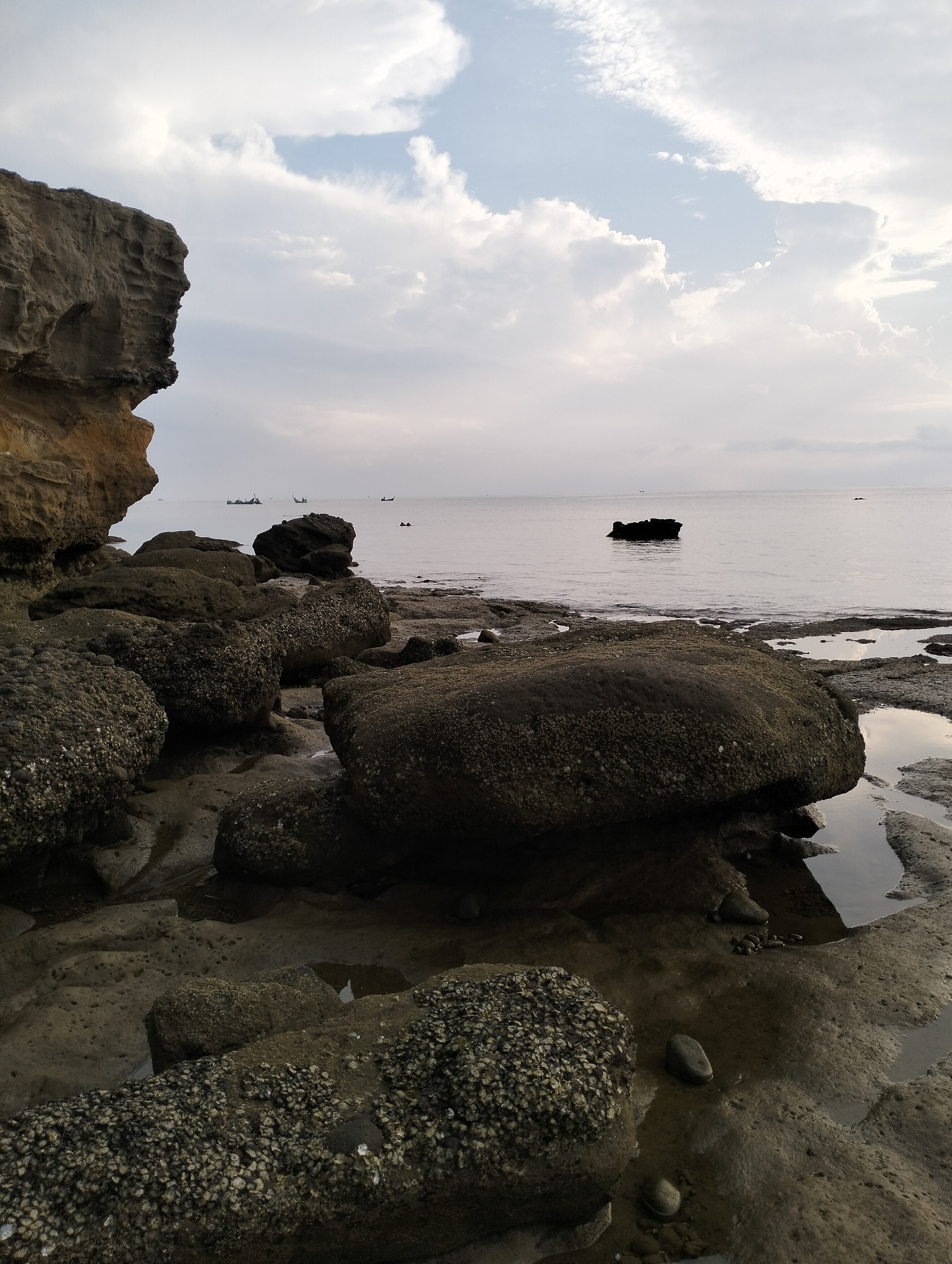 The image shows a rocky coastline in Lhokmanee, Indonesia. Large, dark, barnacle-covered rocks dominate the foreground, with pools of water reflecting the sky. A rock cliff is on the left. In the dist…read more