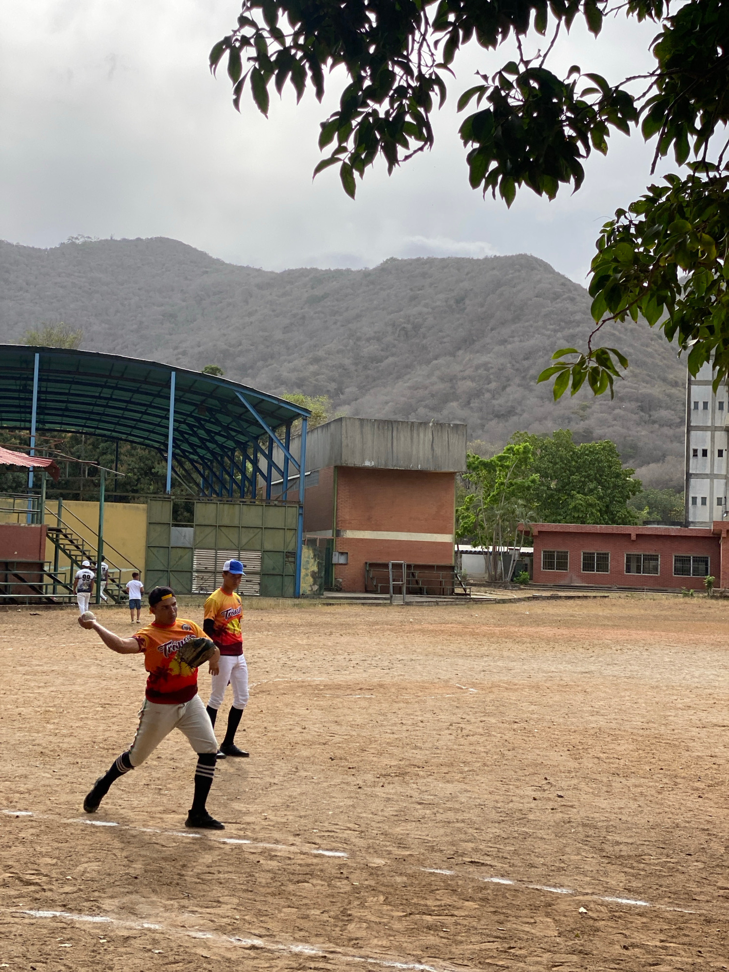The image shows a baseball field in Las Piedras, Venezuela. Two baseball players in orange and white uniforms are the main subjects. One player is throwing a baseball, and the other is standing behind…read more