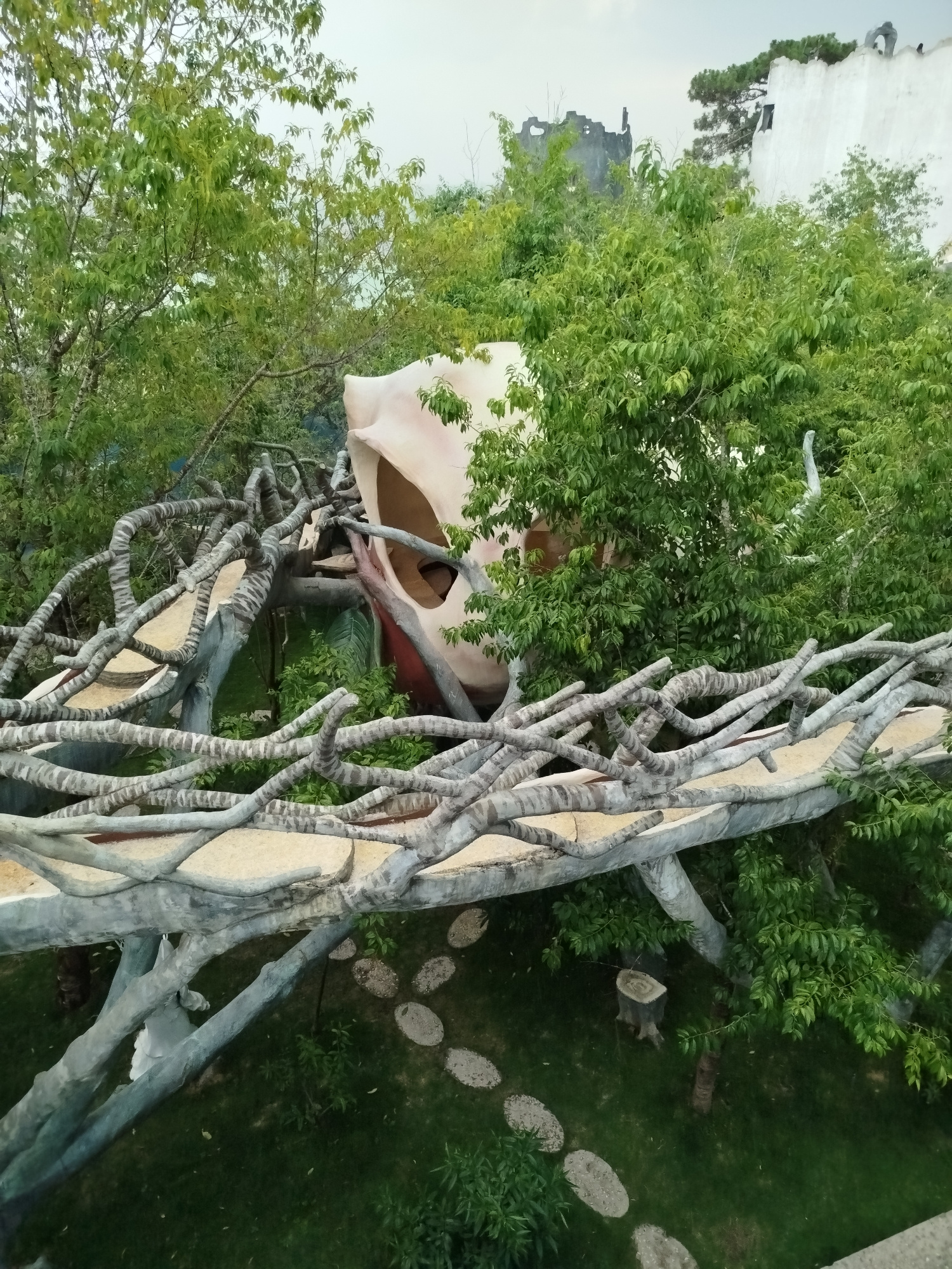 The image depicts a high-angle view within Crazy House, an unconventional structure located in Da Lat, Vietnam. A winding, elevated pathway resembling tree branches dominates the foreground, construct…read more