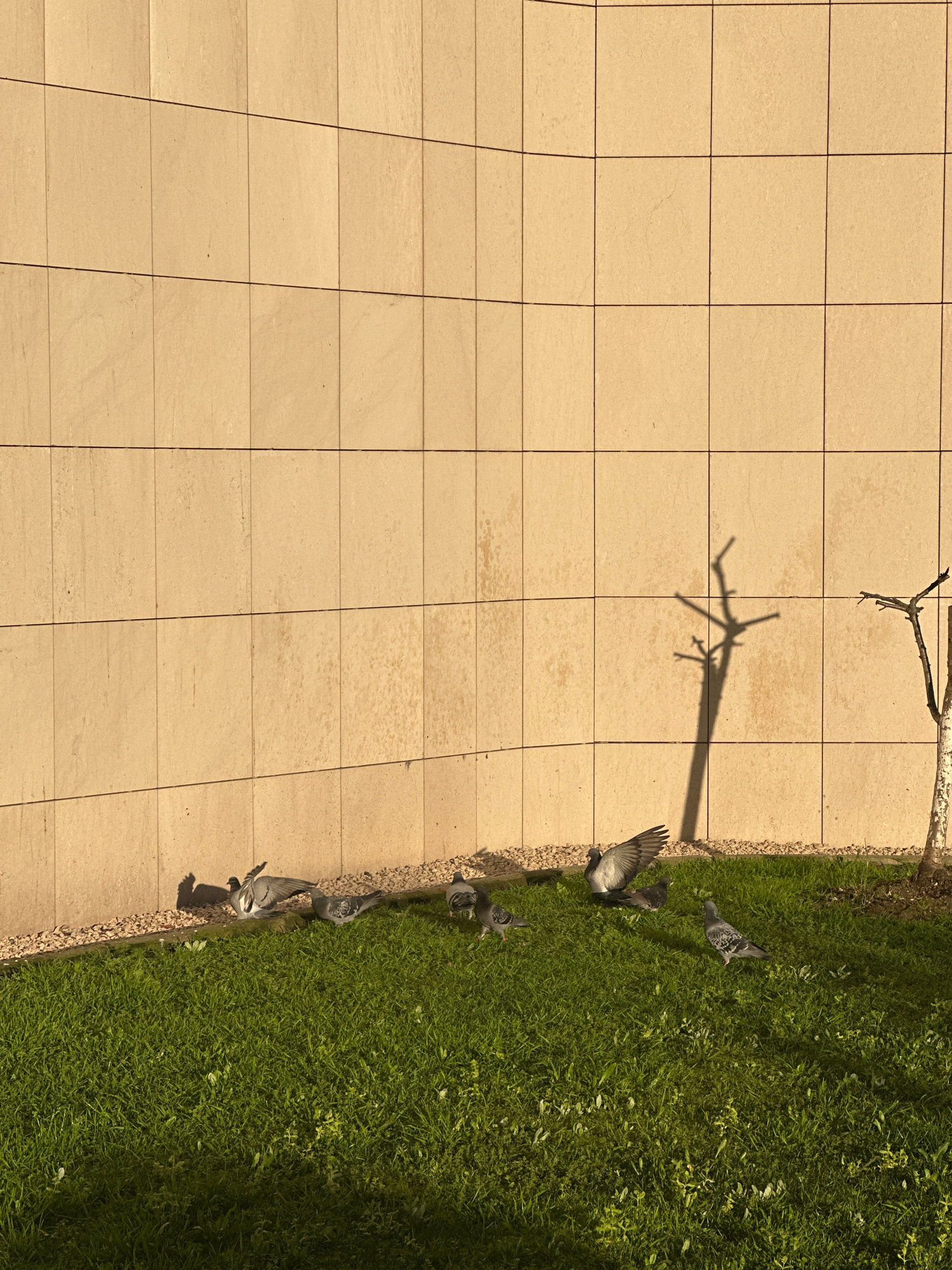 View from above depicting a tiled area and a grass lawn with pigeons in Esenyurt, Turkey. The tiles are light beige and square. Adjacent to the tiles is a patch of green grass. Several gray pigeons arβ¦read more