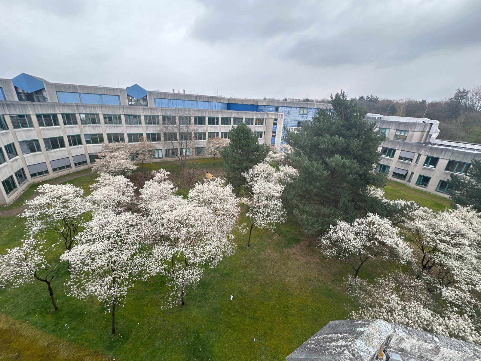A high-angle shot depicts a courtyard situated between a modern office building and a wooded area, likely captured on an overcast day. The office building features a gray facade with blue accents and multiple windows. The courtyard is covered in green grass and dotted with numerous trees, most of which are in full bloom with white flowers. Two large, dark green conifer trees are also present. A person wearing a yellow shirt is visible near the center of the frame, standing among the trees. The image is taken from an elevated position, possibly a balcony or a high window, evidenced by the concrete structure in the lower right corner. The location is the Radboud University campus in Nijmegen, Netherlands. | Open Wire