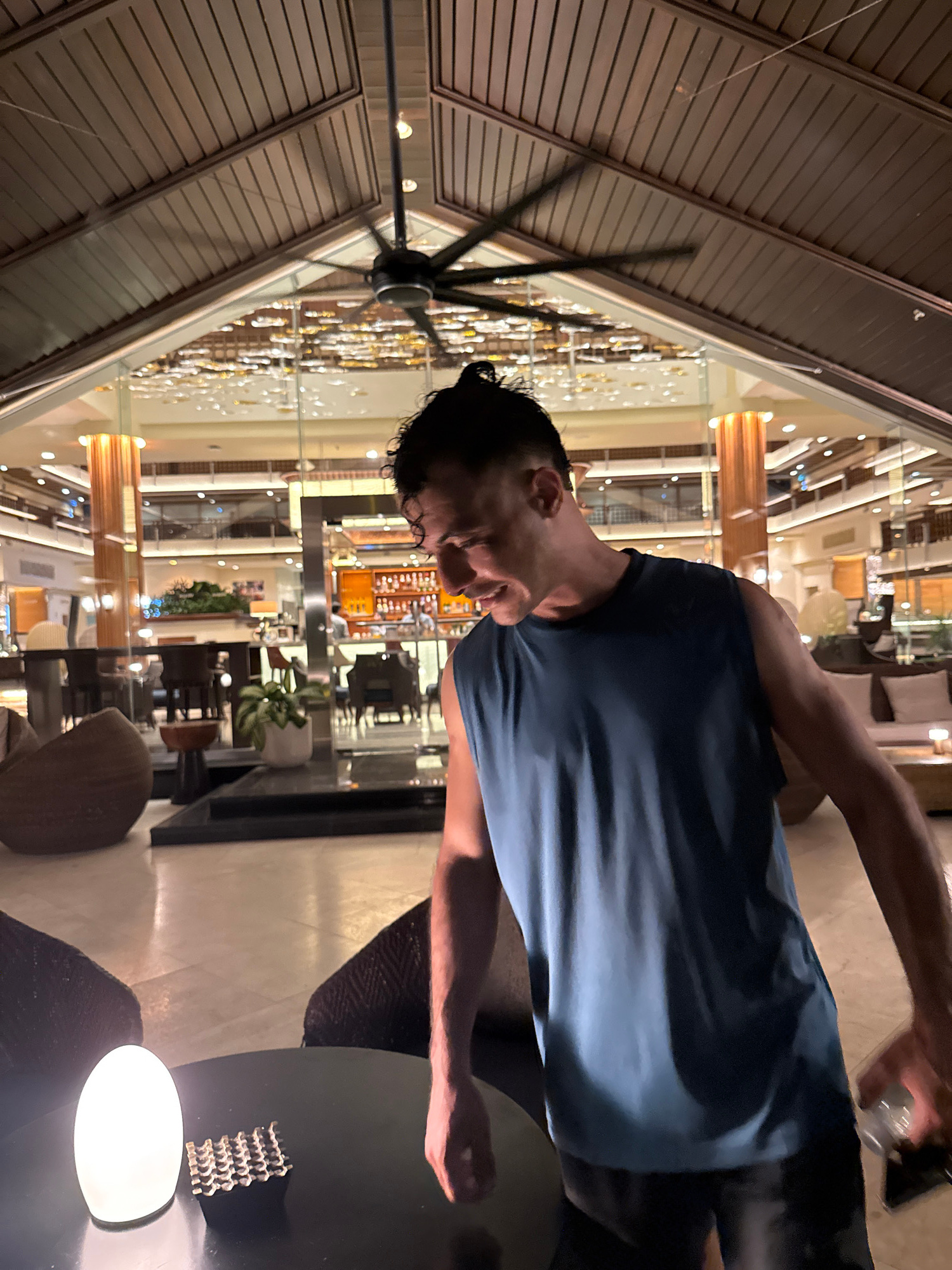 A person wearing a blue sleeveless shirt is seated at a table, holding a glass. The location appears to be a multi-story hotel atrium, with visible architectural details including a ceiling fan and deβ¦read more