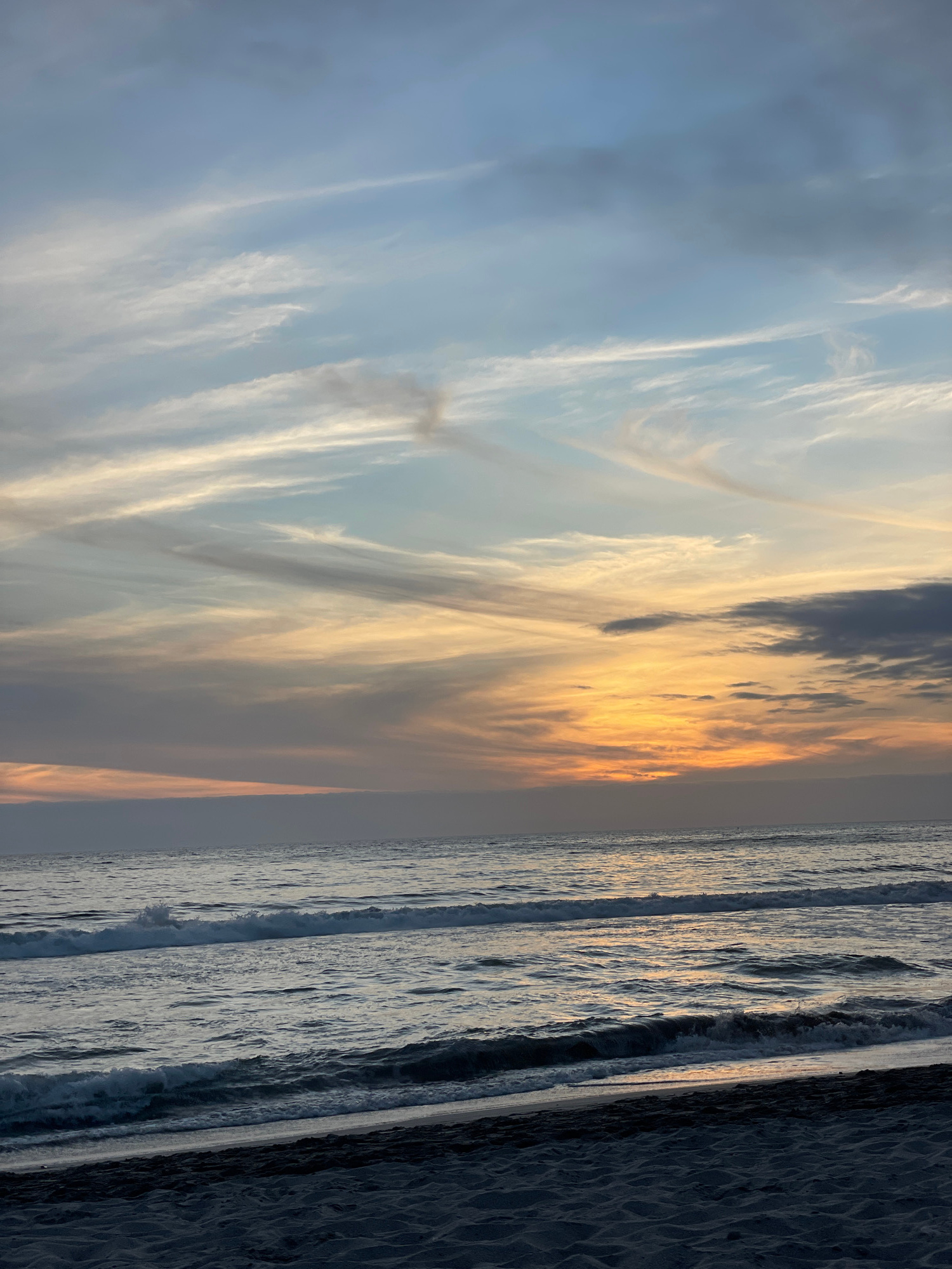 The image depicts a coastal scene in Iquique, Chile at sunset. The sky is a blend of blue and gold hues, with wispy clouds. The ocean is visible, reflecting the colors of the sky. Waves are breaking o…read more