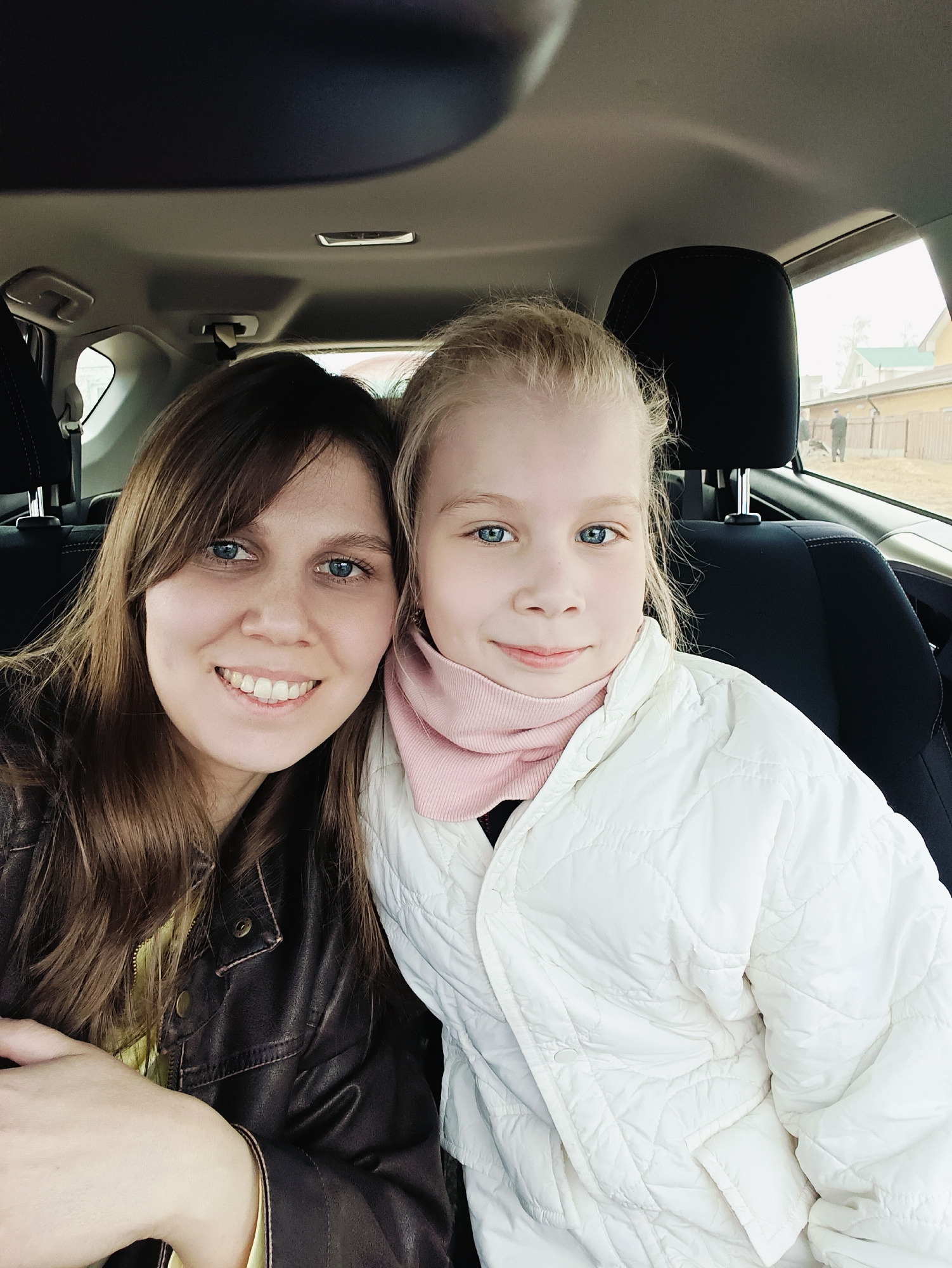 The image displays a close-up, eye-level portrait of two females, an adult woman and a young girl, sitting side-by-side in the back seat of a car. Both subjects are looking towards the camera with gen…read more