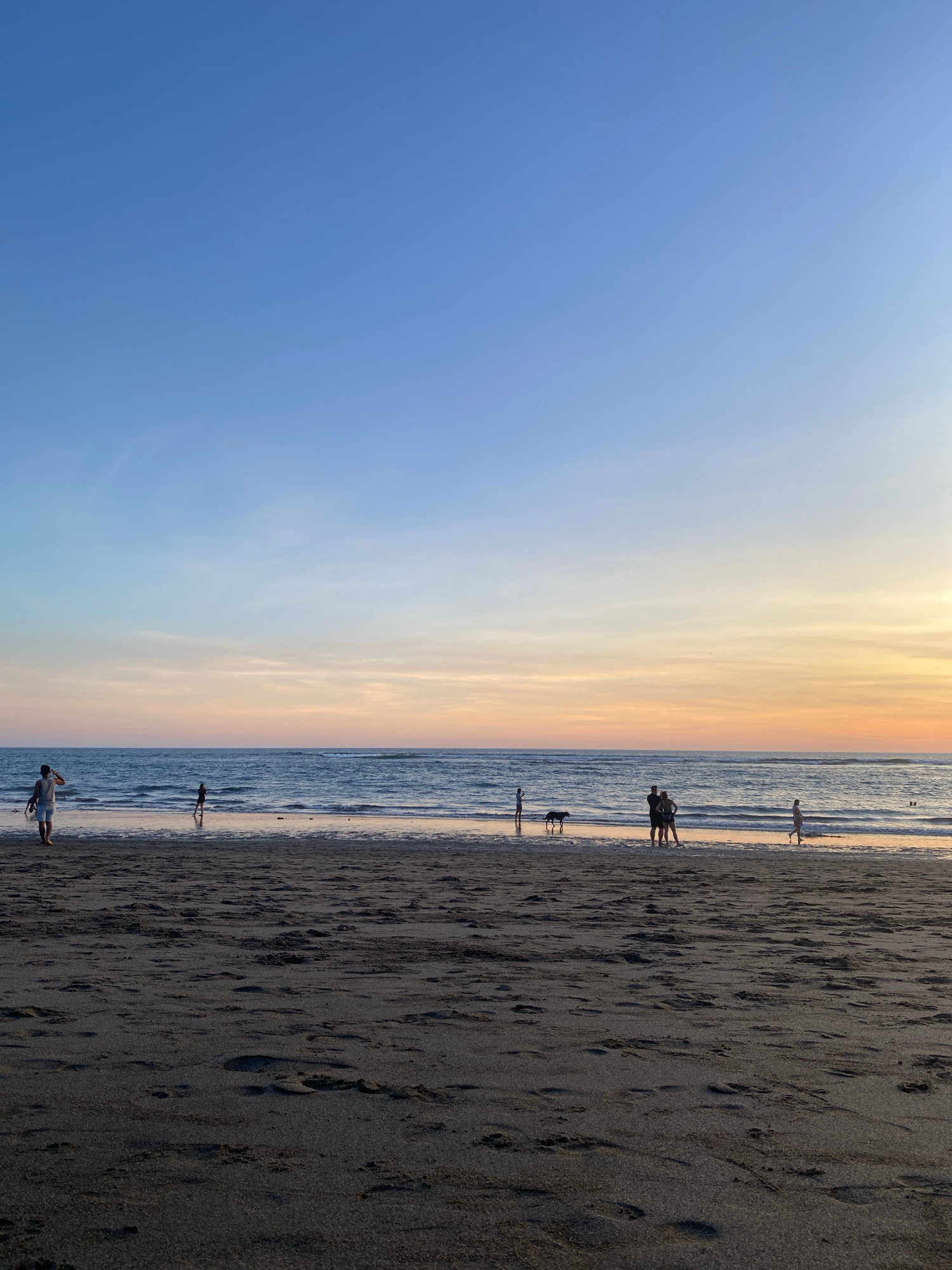 The image shows a beach scene in North Kuta, Indonesia, likely during sunset. The sky transitions from blue to orange near the horizon. The ocean is visible in the middle, with gentle waves. Several p…read more